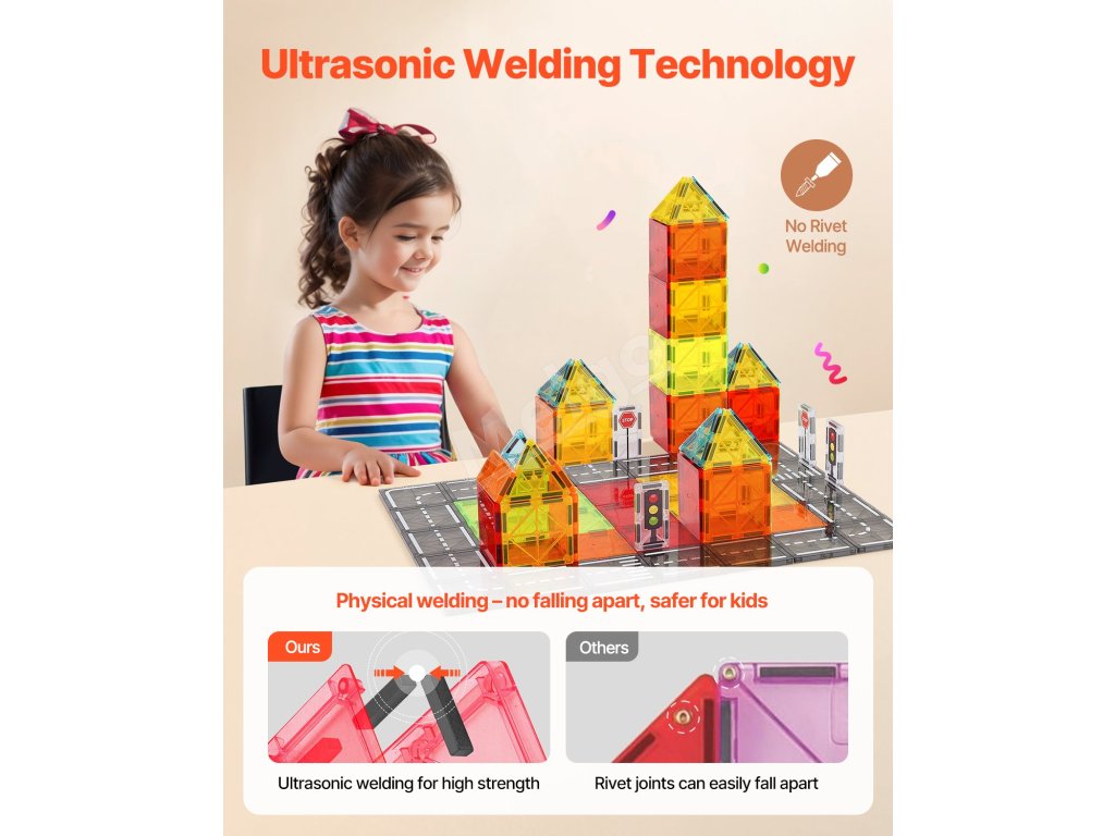 Naše magnetické stavebné dieliky, ktoré sú navrhnuté na hodiny nepretržitej hry, sú vybavené silnými magnetmi, vďaka ktorým všetko bezpečne drží na svojom mieste. Či už staviate vysoké veže alebo zložité stavby, deti sa môžu hrať s istotou, pretože vedia, že ich výtvory zostanú stabilné.