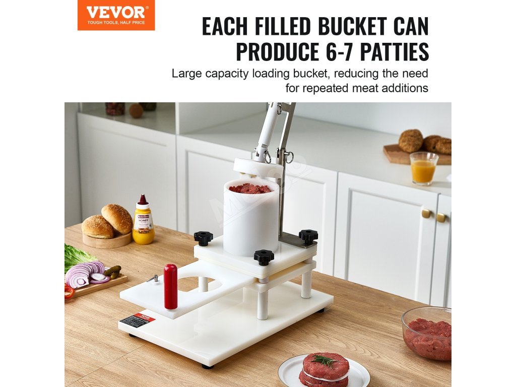 Stroj na výrobu hamburgerových plátkov zvyšuje efektivitu kuchyne. Zásobník, keď je naplnený mäsom, môže stlačiť 6-7 plátkov naraz, čo výrazne zvyšuje rýchlosť výroby hamburgerov. Je vyrobený z potravinárskeho PE materiálu, je odolný a ľahko sa čistí.