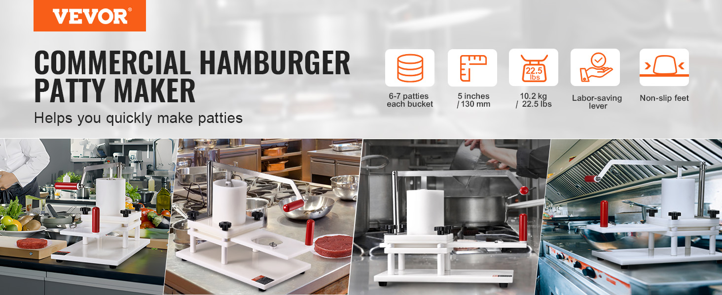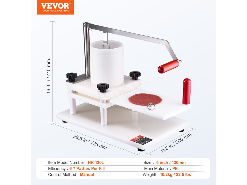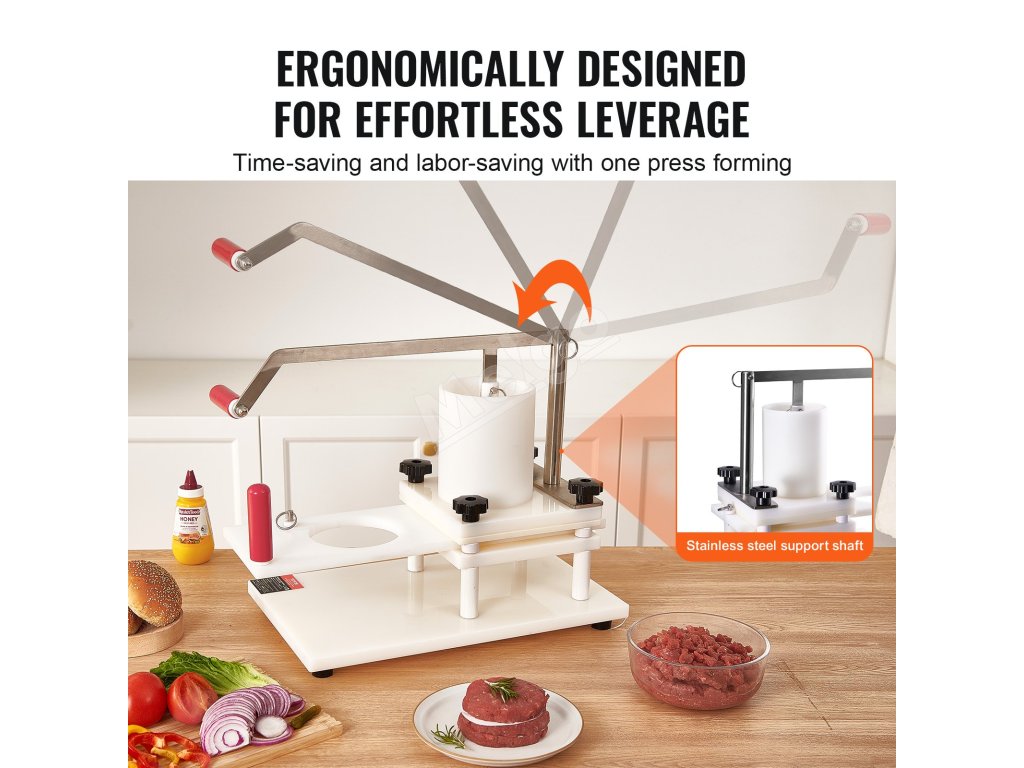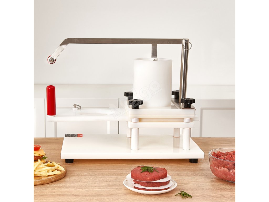 Ľahký nástroj na formovanie mäsových plackov sa dá ľahko premiestniť na akékoľvek miesto. Vhodný na použitie vo vonkajších stánkoch, školských kuchyniach, hoteloch, hamburgerových reštauráciách atď.