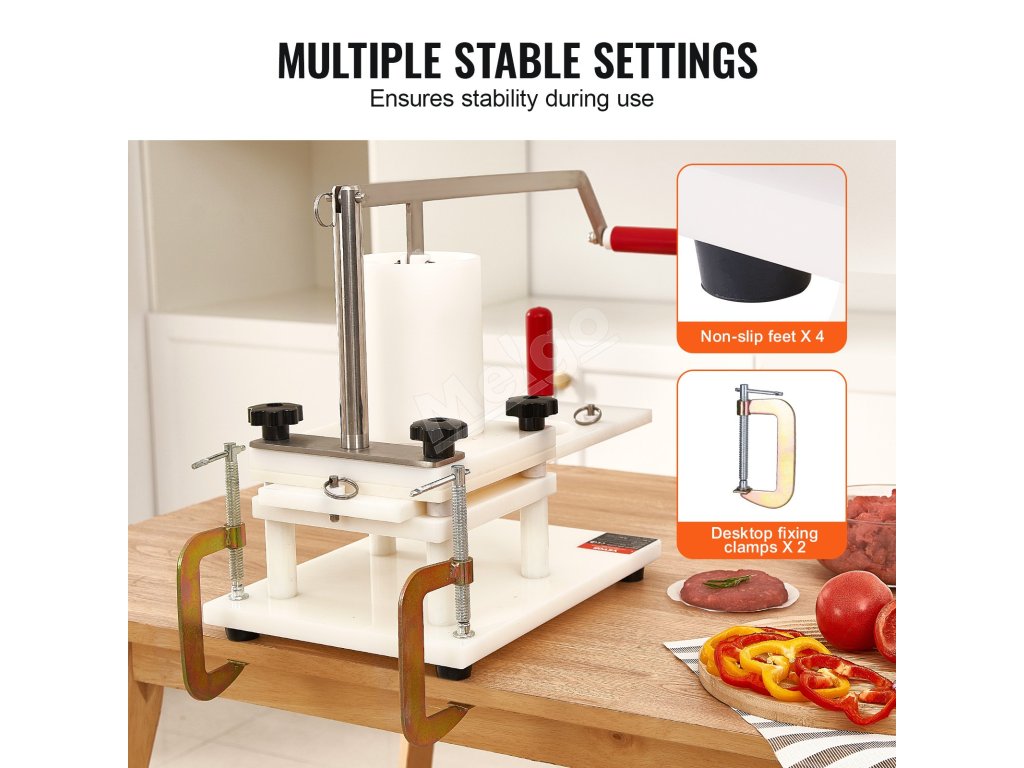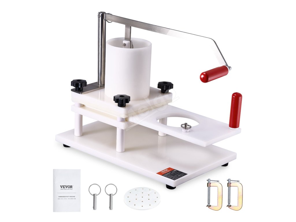 Kruhy a rukoväte na ťahanie uľahčujú používanie komerčného lisu na hamburgery. Stolové svorky a protišmykové nožičky poskytujú dodatočnú stabilitu počas prevádzky.