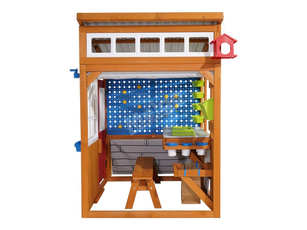 Náš drevený vonkajší domček na hranie je určený pre deti vo veku 3 až 10 rokov a je vybavený elektronickým zvončekom, pracovným stolom a dverami pre domáce zvieratá, ktoré vytvárajú plne interaktívny minidomček. Deti môžu skúmať, hrať sa a rozvíjať sociálne, kreatívne a motorické zručnosti a zároveň si užívať nekonečné dobrodružstvá na záhrade.