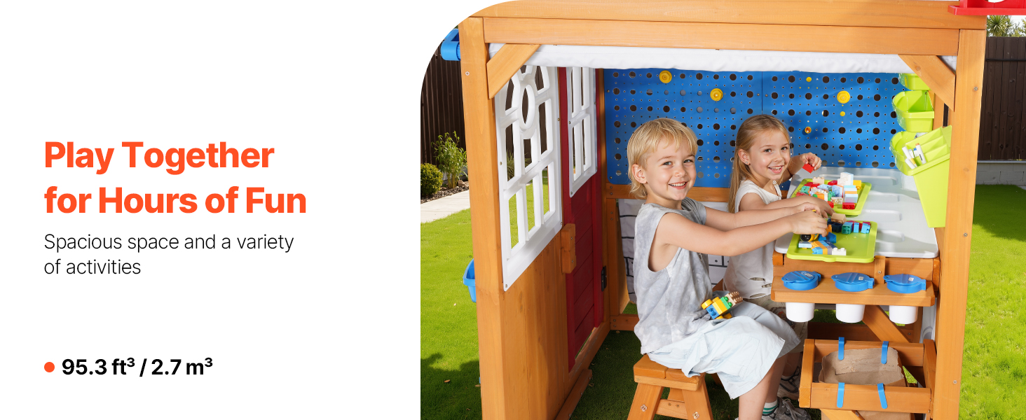 Náš drevený domček na hranie pre deti z cédrového dreva ponúka veľkorysý vnútorný priestor s viacerými zónami aktivít. Deti si môžu užívať hodiny nápaditej zábavy samy alebo s kamarátmi a súrodencami, liezť, skúmať a zapájať sa do nekonečných interaktívnych hier v živom prostredí.