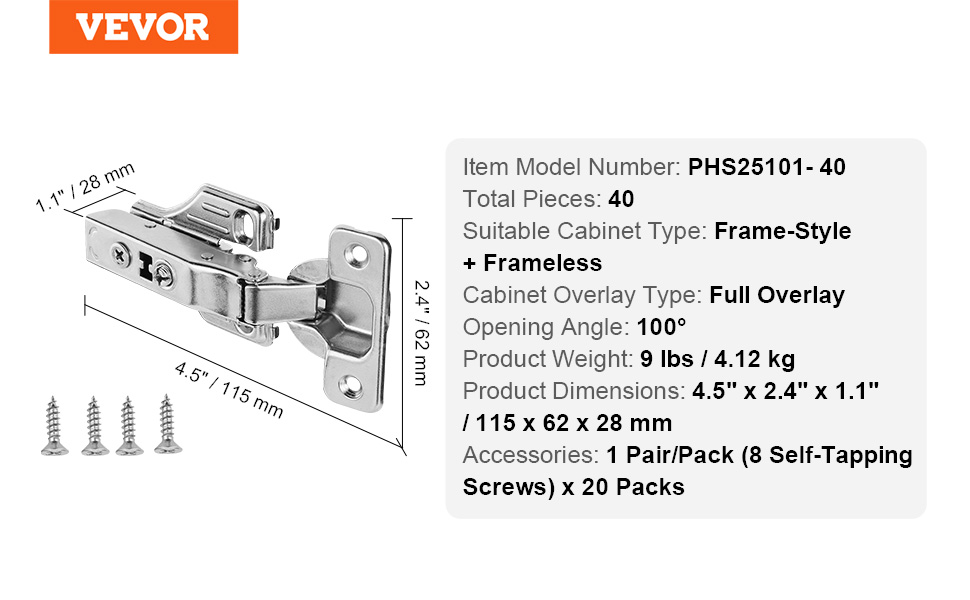 Pánty do skríň 40 ks, plné prekrytie, 100° otvorenie, mäkké zatváranie