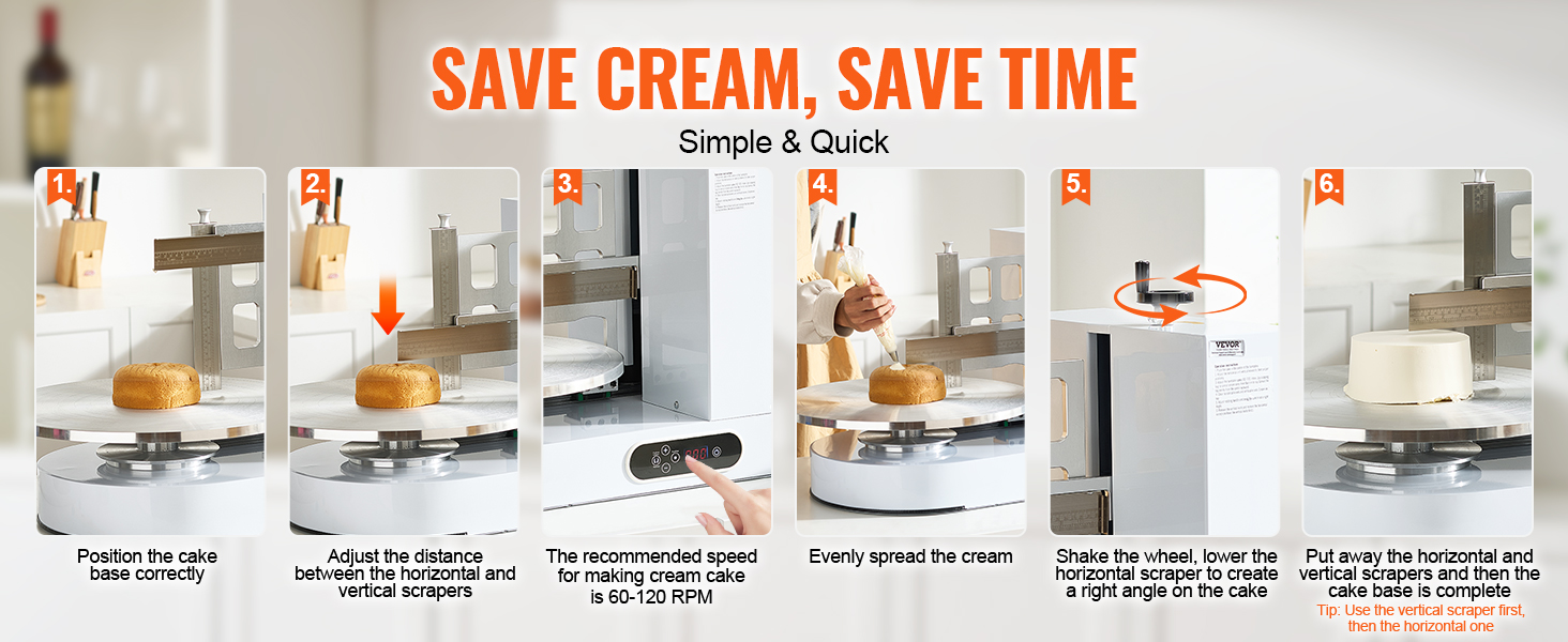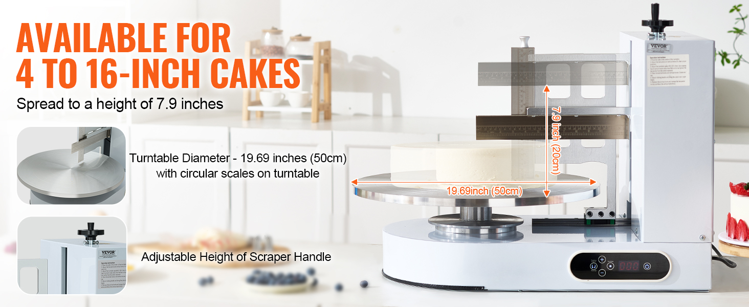 Stroj na potieranie zdobenia tort je vhodný na torty s veľkosťou od 4 do 16 palcov a výškou 7,9 palca. Štandardný maslový krém možno ľahko vytvoriť, čím sa zabezpečí stabilná kvalita torty.