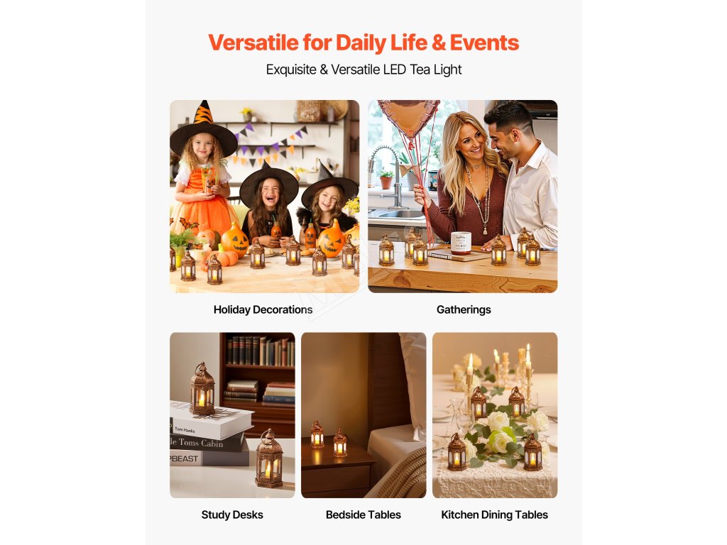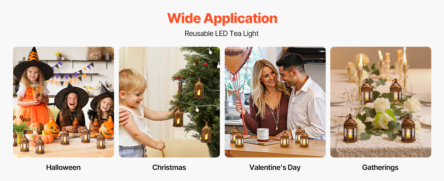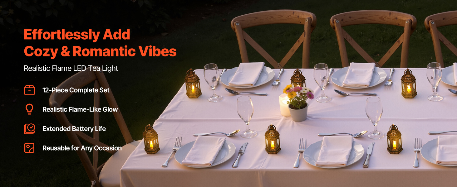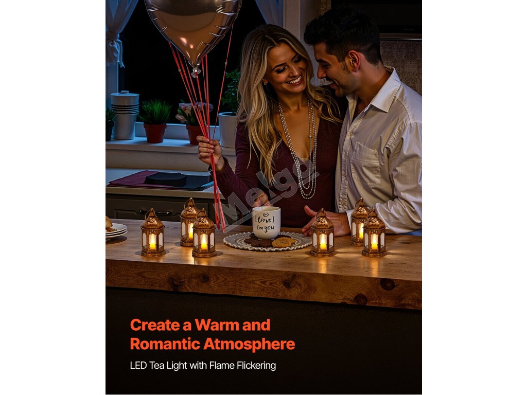 12-dielna súprava elektrických lampášov na sviečky vytvára realistickú žiaru plameňa bez nebezpečenstva požiaru. Je vhodná na svadobné stoly, sviatočné večierky a domáce dekorácie, ktorým dodá hrejivú a romantickú atmosféru pri akejkoľvek príležitosti.