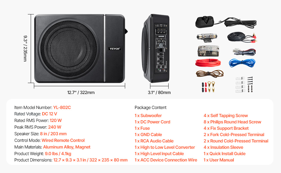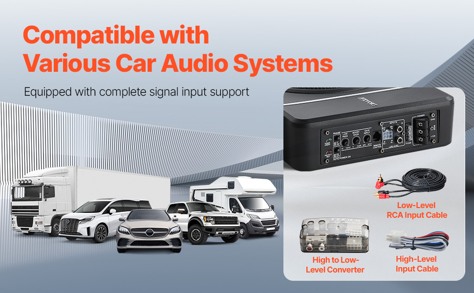 Tento subwoofer je kompatibilný so všetkými typmi vozidiel - automobilmi, SUV, nákladnými vozidlami a karavanmi - a bez problémov sa integruje s vaším audio systémom pomocou audio kábla RCA alebo vysokoúrovňového vstupného kábla, pričom ponúka dokonalé zhody so špičkovými aj zjednodušenými hlavnými jednotkami.