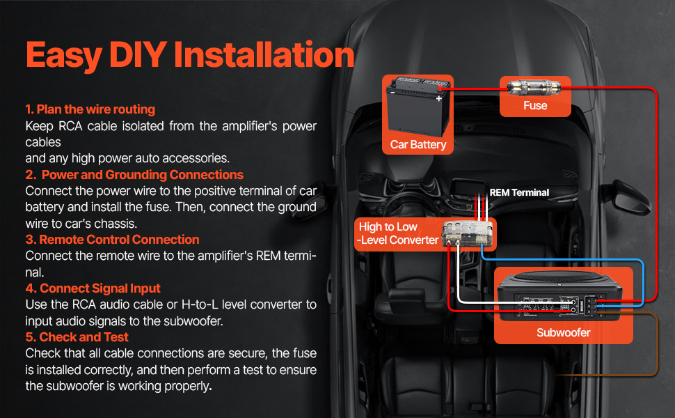 Vďaka podrobnej používateľskej príručke a všetkým potrebným káblom a hardvéru je inštalácia tohto kompaktného subwoofera do auta pod sedadlo hračkou pre domácich majstrov aj profesionálnych inštalatérov. Počas inštalácie nezabudnite kvôli bezpečnosti odpojiť záporný pól batérie.