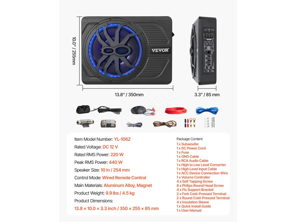 Tento 10" subwoofer do auta pod sedadlo je nevyhnutnou výbavou pre nadšencov automobilového audia, pretože poskytuje silné basy a čistý zvuk a zároveň šetrí miesto vďaka svojmu štíhlemu 3,3" profilu. Je vybavený vstupom s vysokou/nízkou úrovňou, maximálnym výkonom 440 W a modrým náladovým svetlom, čím výrazne posúva váš zvukový zážitok na novú úroveň.