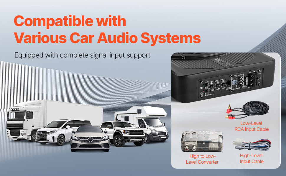 Tento subwoofer je kompatibilný so všetkými typmi vozidiel - automobilmi, SUV, nákladnými vozidlami a karavanmi - a bez problémov sa integruje s vaším audio systémom pomocou audio kábla RCA alebo vysokoúrovňového vstupného kábla, pričom ponúka bezchybné zhody so špičkovými aj zjednodušenými hlavnými jednotkami.