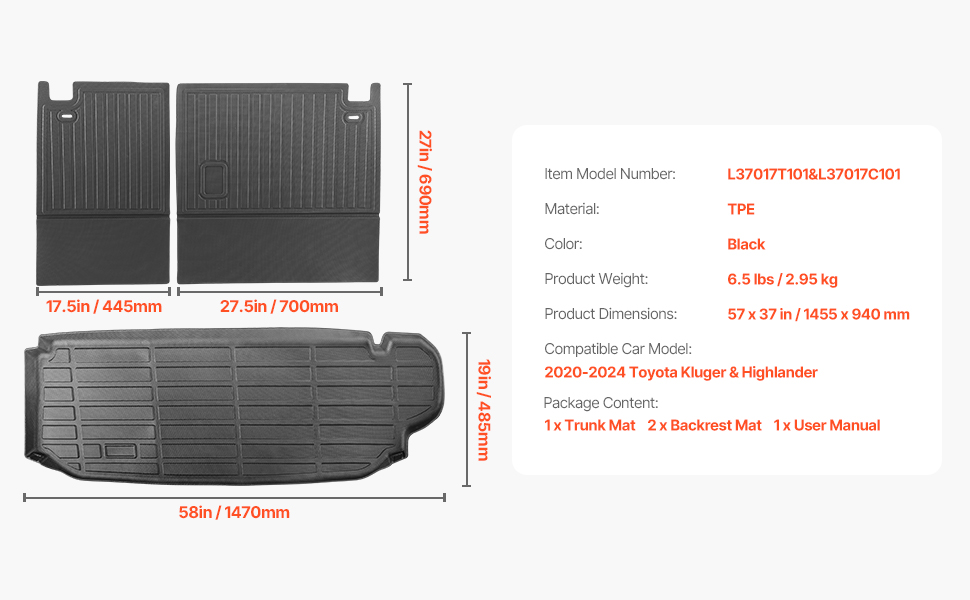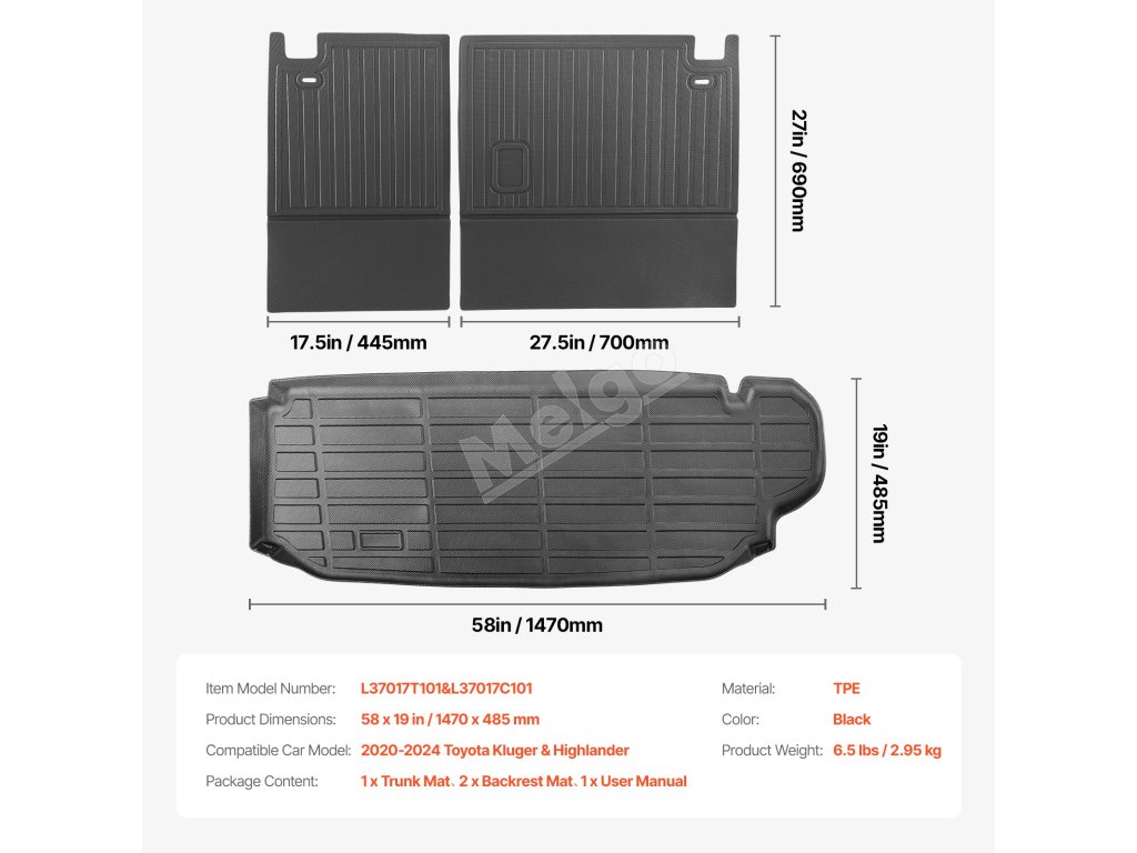Naša na mieru vyrobená podložka do batožinového priestoru s operadlom je kompatibilná s modelmi Toyota Kluger & Highlander 2020-2024. Vďaka presnému tvarovaniu 3D laserovým skenovaním, jednoduchej inštalácii na suchý zips a materiálu TPE odolnému voči všetkým poveternostným vplyvom zaručuje dokonalé prispôsobenie a udržuje interiér vášho vozidla čistý a nedotknutý.