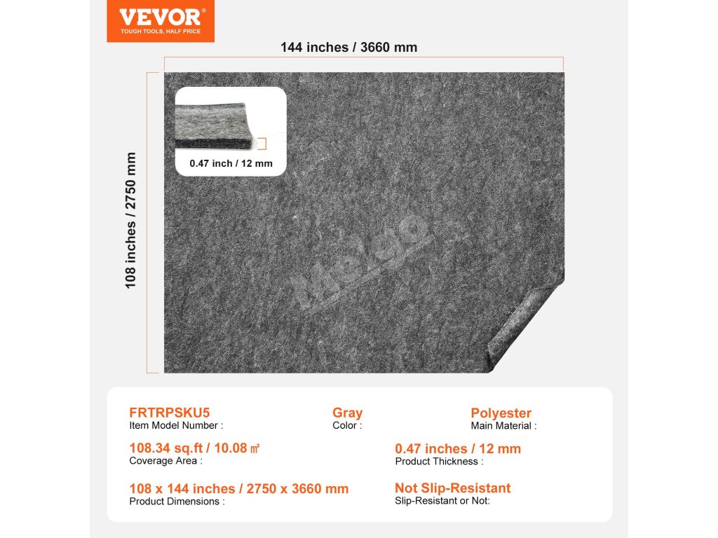 Podložka pod koberec 9'×12' 1/2" 100% polyester filc sivá pre podlahy