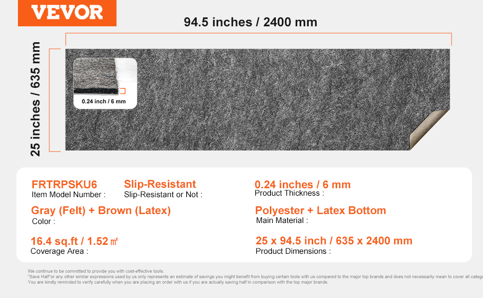 Protišmyková podložka pod koberec 2'×8', 1/4" hrubá, filc+latex, 1-2㎡