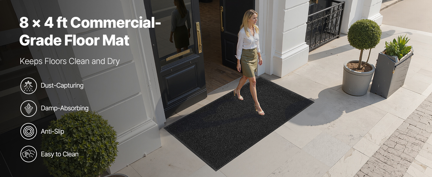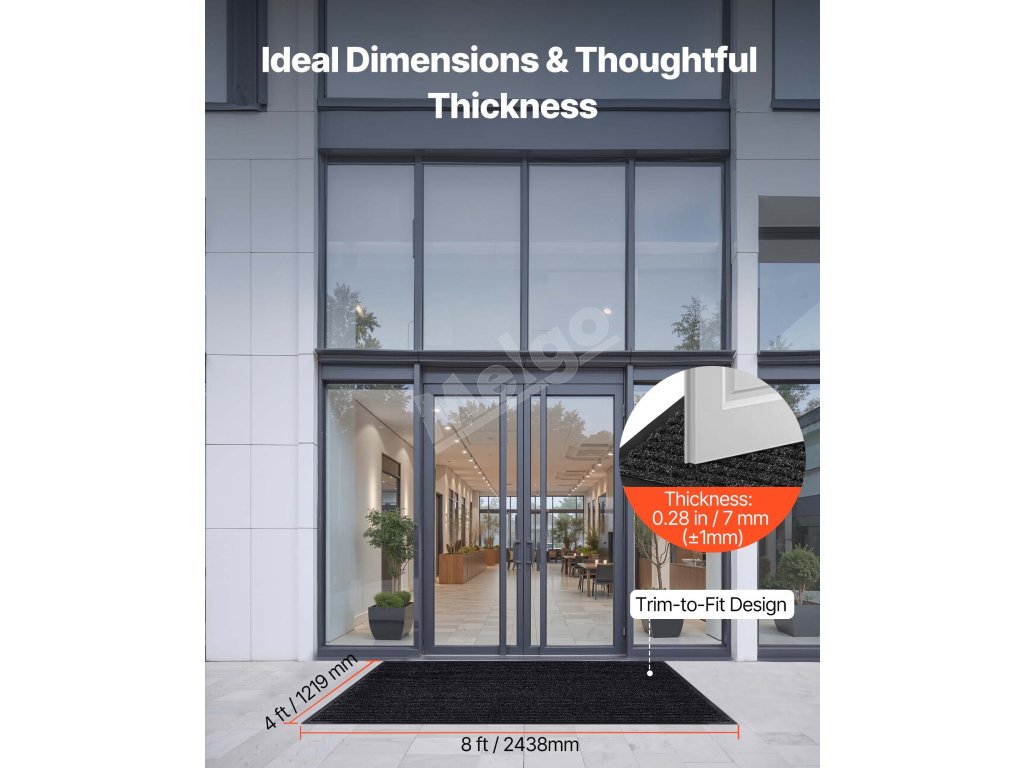 Rohožka na predné dvere s rozmermi 8 x 4 stopy / 2438 x 1219 mm dokonale pokryje chodby, terasy, verandy a iné otvorené priestory a ponúka praktickosť aj univerzálne použitie.