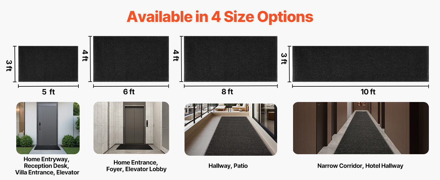 K dispozícii vo viacerých rozmeroch od 5 x 3 stopy / 1524 x 914 m do 10 x 3 stopy / 3048 x 914 mm, vhodné pre vchody a verandy rôznych rozmerov.