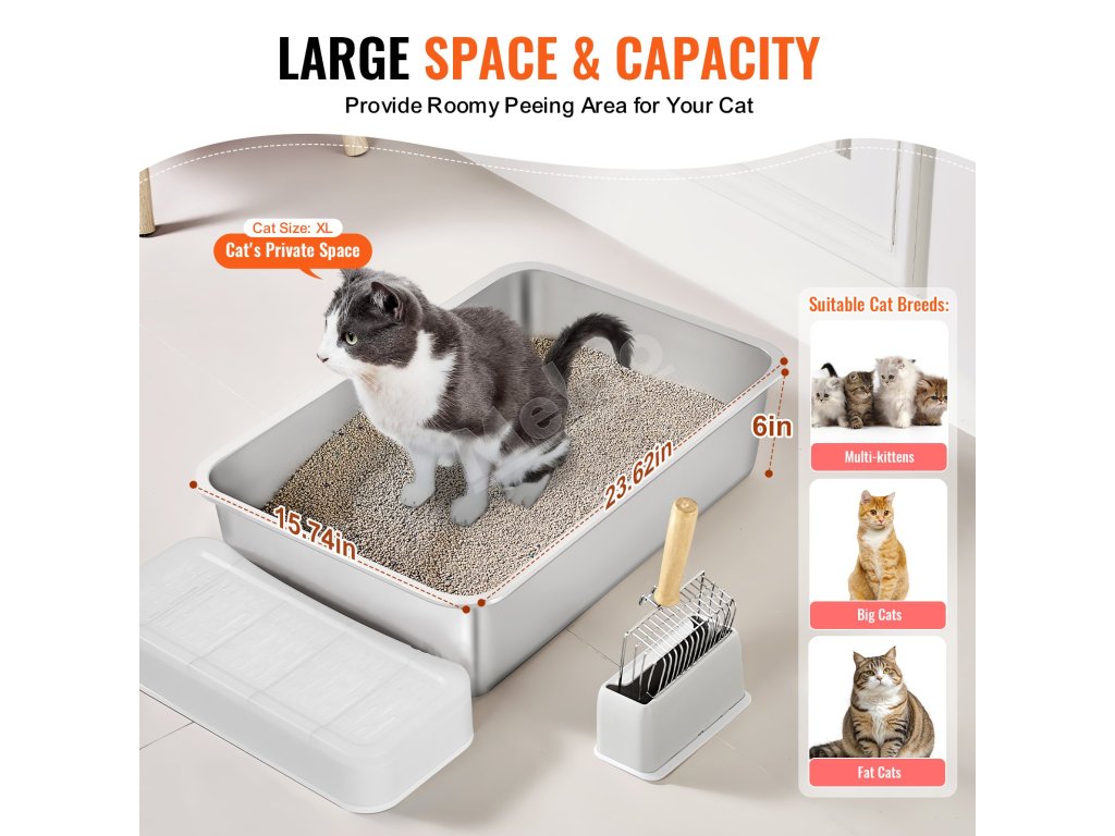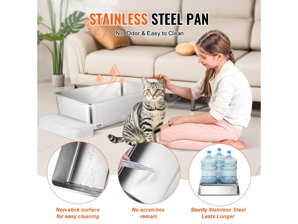 Tento box na podstielku pre mačky je vyrobený z nehrdzavejúcej ocele odolnej proti opotrebovaniu, ktorú nie je ľahké poškriabať a dá sa okamžite umyť. Štyri protišmykové nožičky medzitým zaisťujú, že box na podstielku je stabilný a nepohybuje sa, čím udržiava prostredie čisté a bez zápachu.