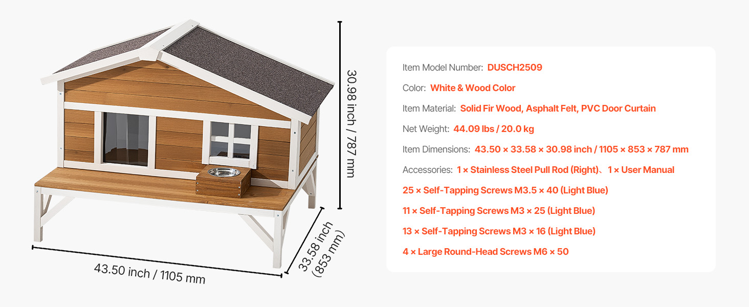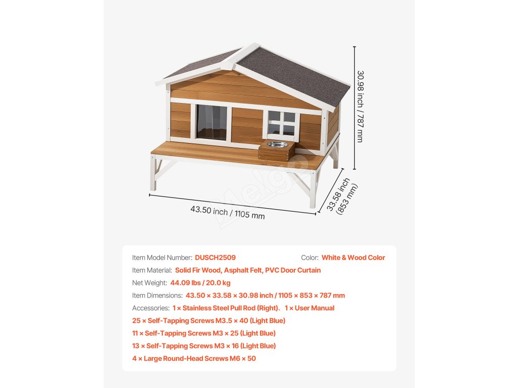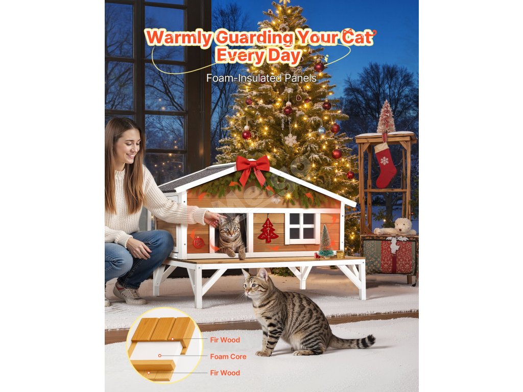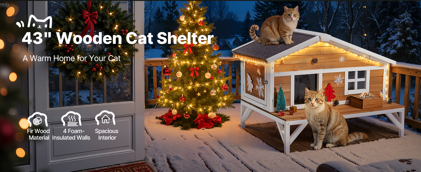 Drevený prístrešok pre mačky s priemerom 43,5 palca je vyrobený z kvalitného jedľového dreva a má dlhú životnosť. Štvorstranná penová izolácia udržiava mačky v teple v chladnom počasí, zatiaľ čo priestranný interiér umožňuje lezenie a hru.