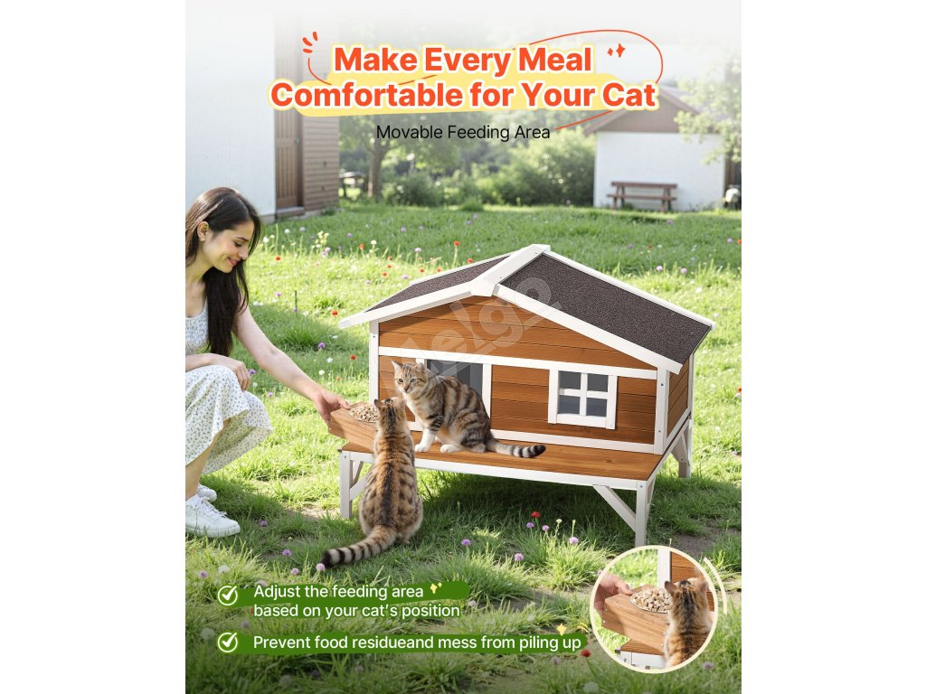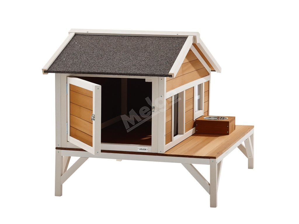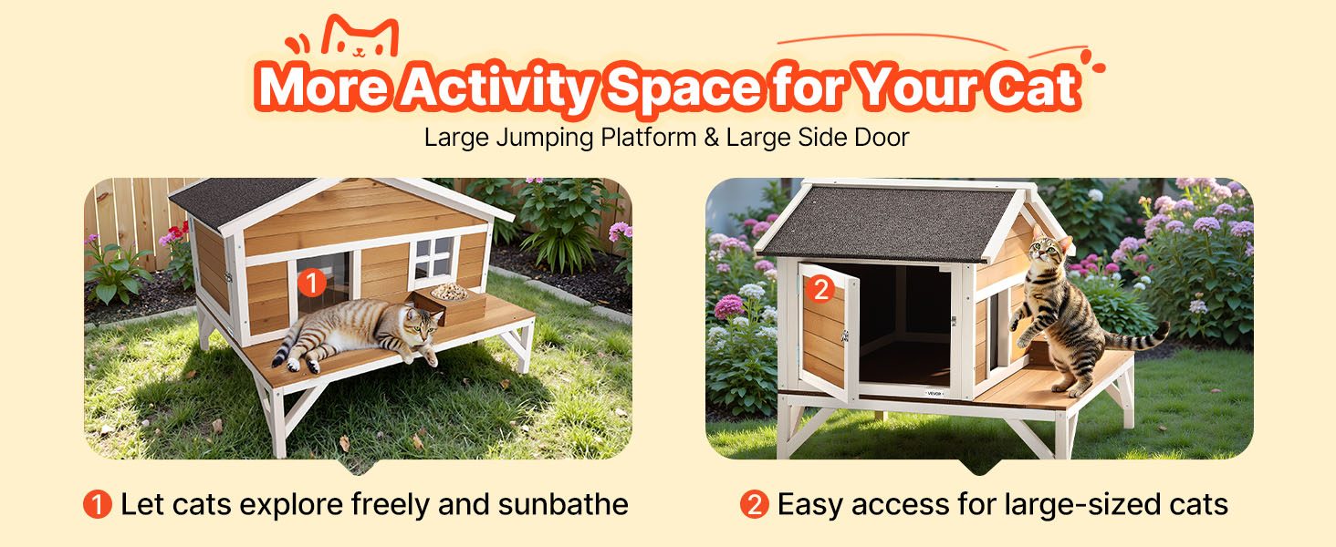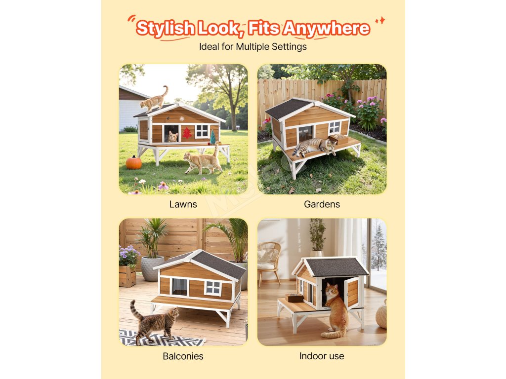 Tento vyvýšený domček pre mačky má veľké bočné dvere, vďaka ktorým je ideálny pre väčšie mačky alebo rodiny s viacerými mačkami. Vyvýšená plošina na skákanie poskytuje mačkám ďalší priestor na šplhanie, skúmanie a vyhrievanie sa na slnku.