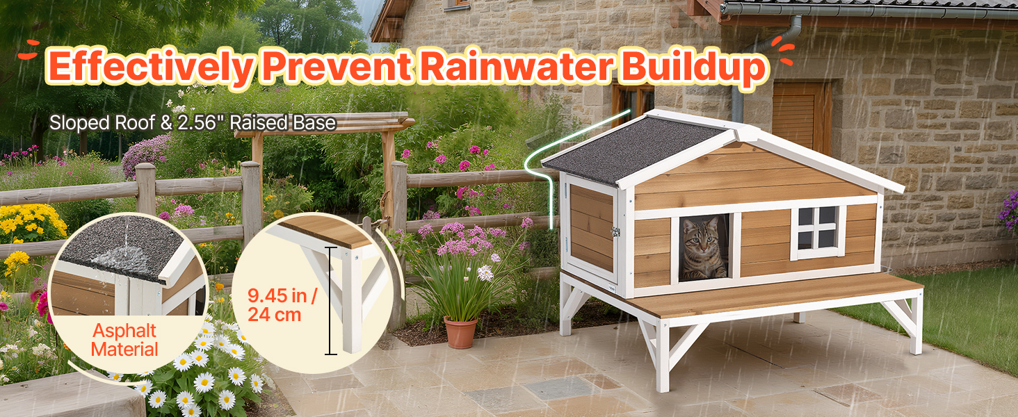 Náš vonkajší domček pre mačky so šikmou asfaltovou strechou zabraňuje hromadeniu dažďa a zvyšuje pohodlie mačky. Zvýšená základňa s priemerom 2,56" (6,5 cm) zabraňuje zemnej vlhkosti a chladu, čím zabezpečuje suché a útulné prostredie.