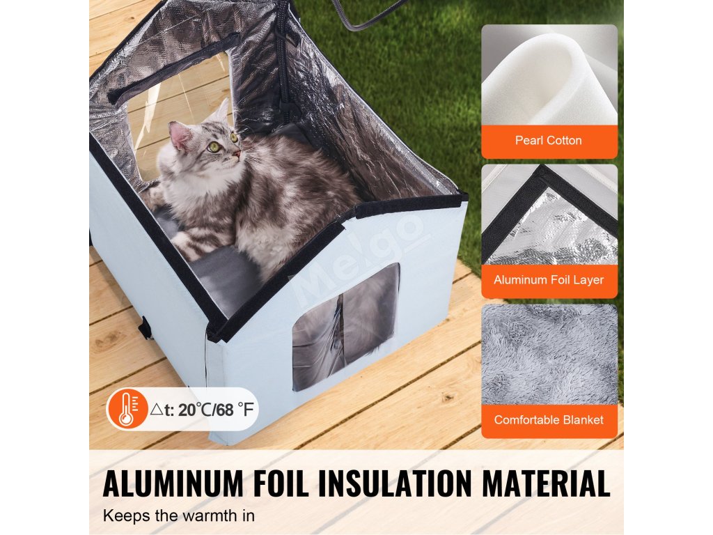 Zabudovaná vyhrievacia podložka a mäkká deka udržiavajú telesnú teplotu vašej mačky v správnej výške. Šesťstranná hliníková fólia a perleťová bavlnená izolácia výrazne znižujú tepelné straty a vytvárajú teplé zimné útočisko.