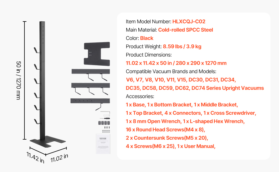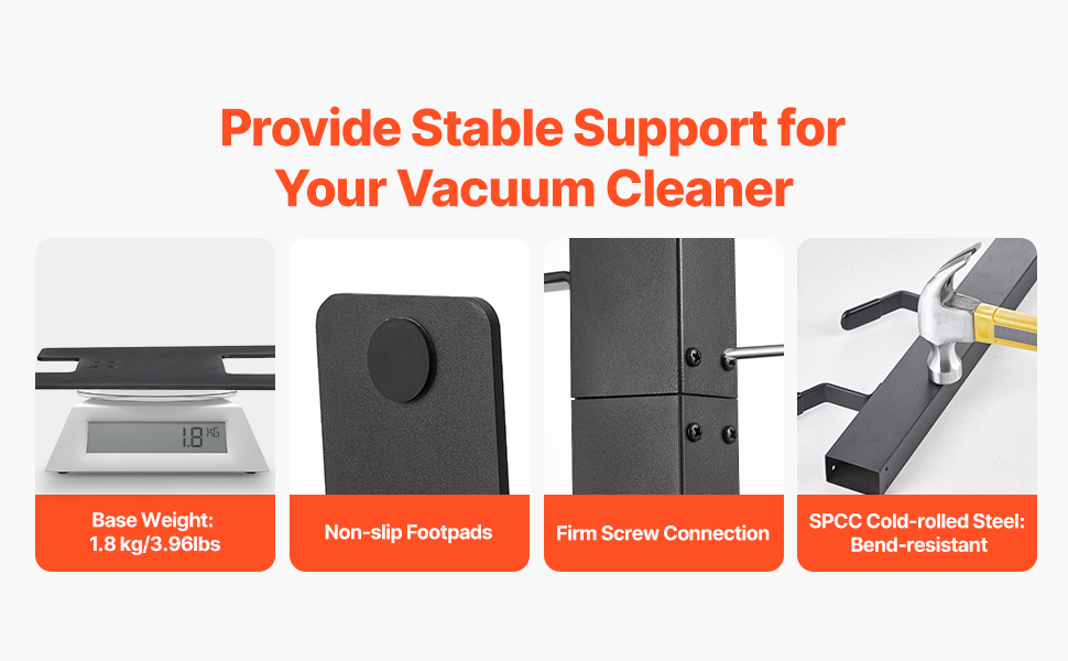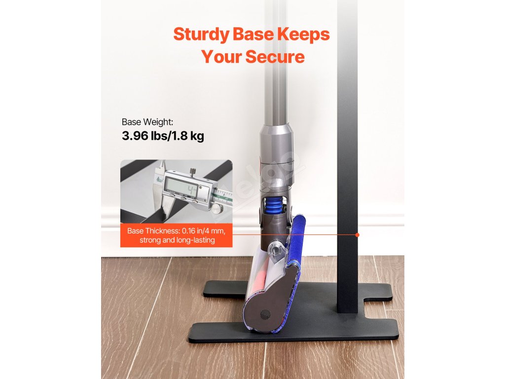 Náš stojanový držiak na vysávač má 3,96 lbs/1,8 kg ťažkú základňu s protišmykovými podložkami a skrutkovými spojmi, ktoré zabezpečujú stabilitu. Je vyrobený z odolnej za studena valcovanej ocele SPCC, odoláva ohýbaniu a deformácii a poskytuje dlhodobú podporu pre váš vysávač.