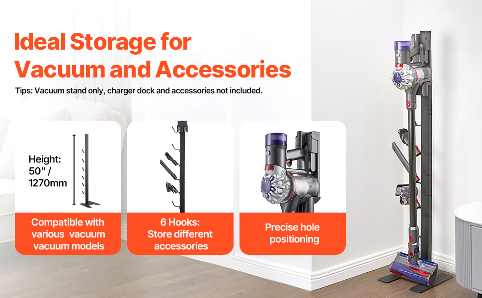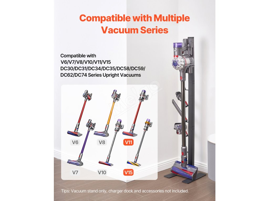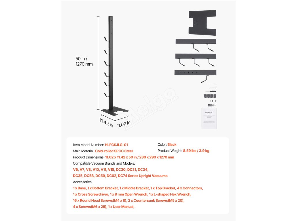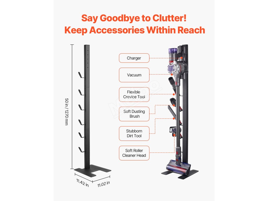 Tento 50-palcový stojan na vysávač je určený pre Dyson, má 6 háčikov a je kompatibilný s viacerými modelmi. Stabilitu zabezpečuje odolná základňa, oceľ valcovaná za studena a protišmykové podložky. Kompaktný, bez vŕtania a s jednoduchou inštaláciou je ideálnym riešením na uskladnenie.