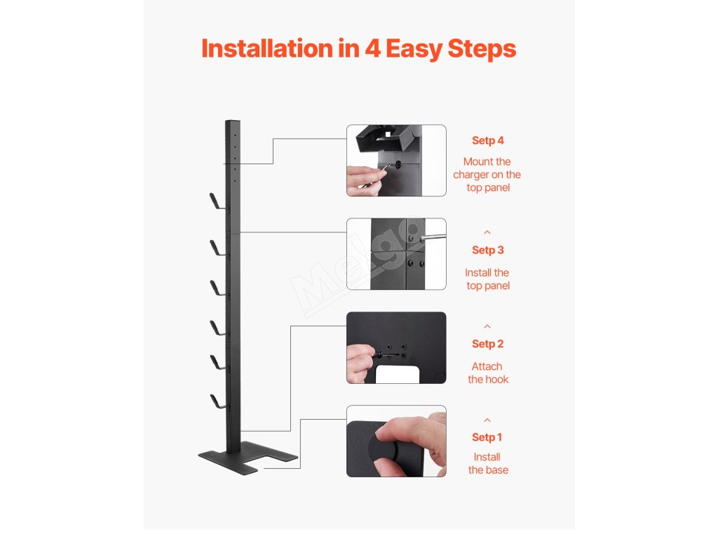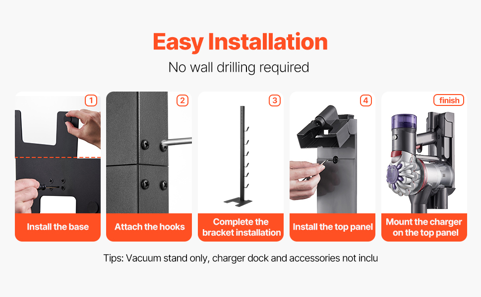 Samostatný stojan eliminuje potrebu montáže na stenu, čo umožňuje bezpečné uloženie vášho vysávača. Vďaka jednoduchým krokom inštalácie základne, háčikov a hornej dosky ho môžete rýchlo nastaviť bez problémov so zložitou inštaláciou.