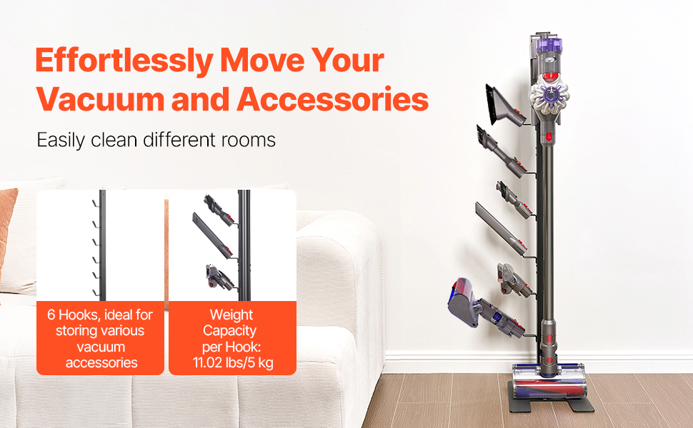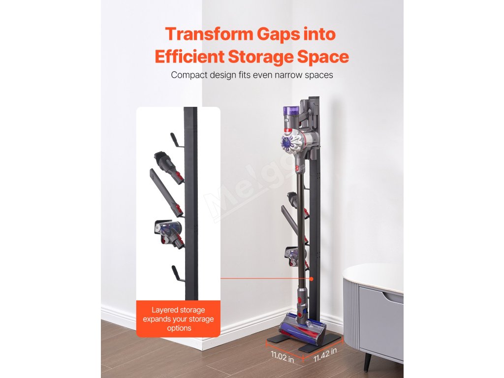 Či už v obývacej izbe, spálni, kuchyni alebo práčovni, tento stojan pomáha usporiadať vysávač a príslušenstvo, čím uvoľňuje miesto na podlahe a udržiava vaše obytné priestory bez neporiadku pre čistý domov.