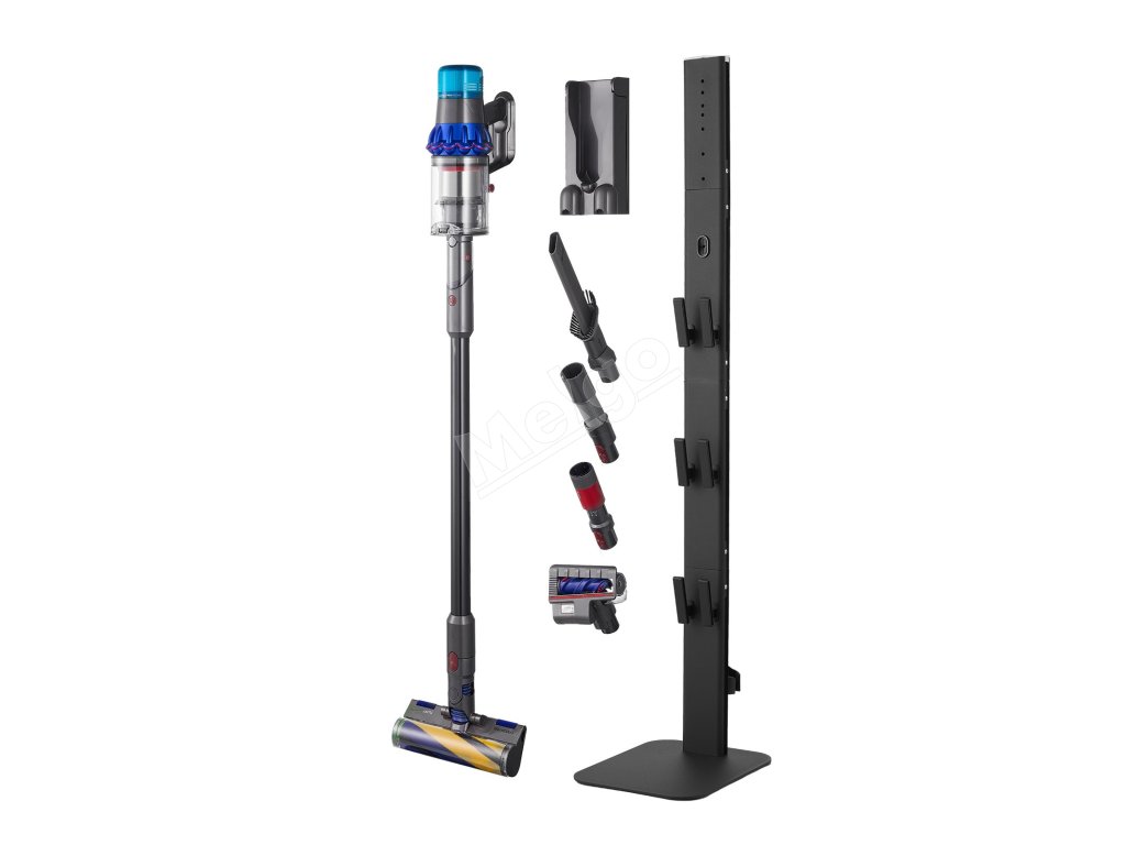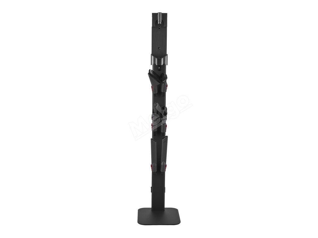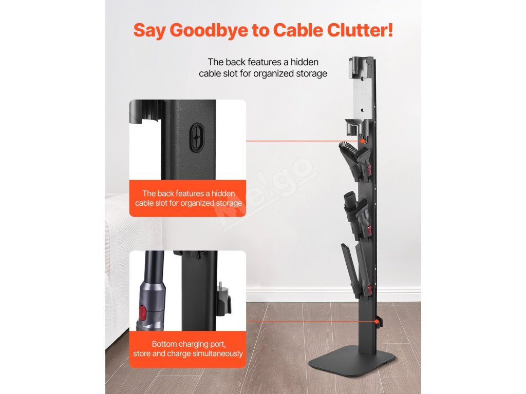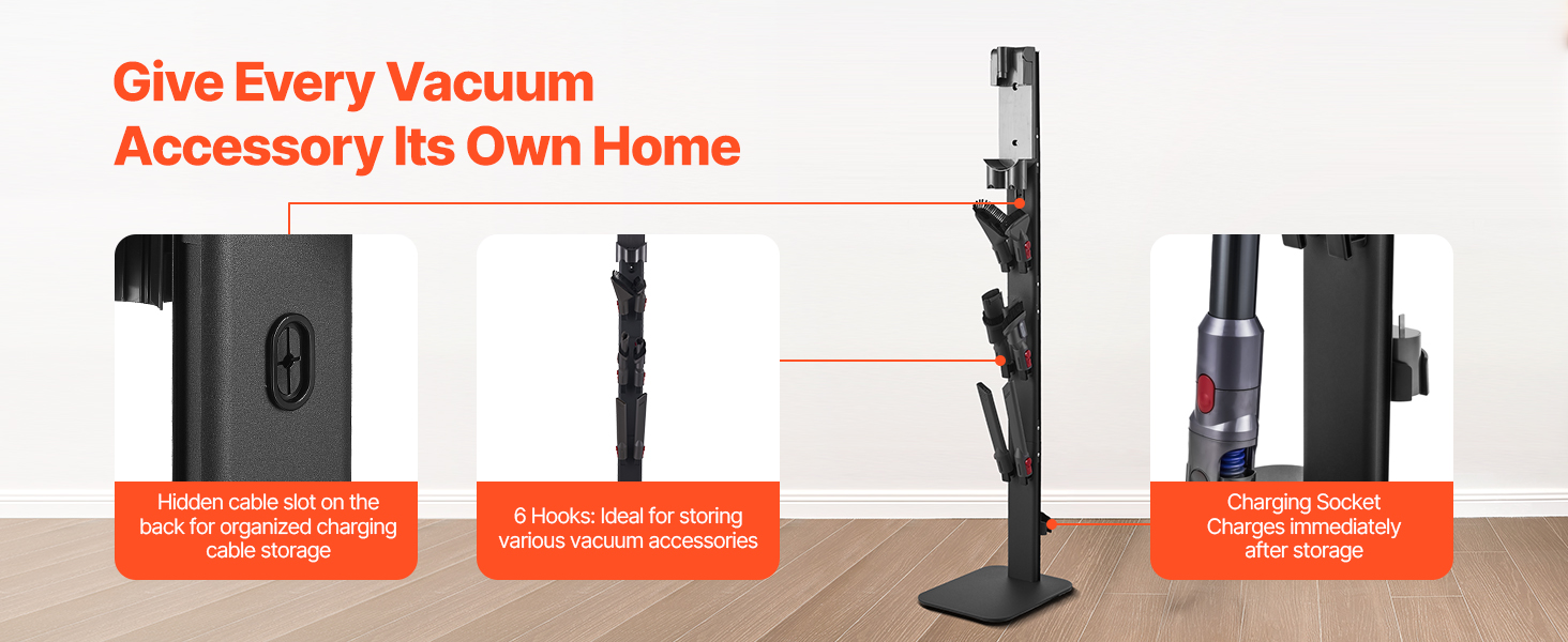 Držiak stojana na vysávač je vybavený 6 háčikmi na prehľadné uloženie vysávacích kief, hadíc a ďalšieho príslušenstva, čím sa zabráni ich strate alebo poškodeniu. Okrem toho štrbina na vedenie káblov na zadnej strane pomáha organizovať káble, zatiaľ čo určená nabíjacia zásuvka umožňuje nabíjať vysávač hneď po uskladnení.