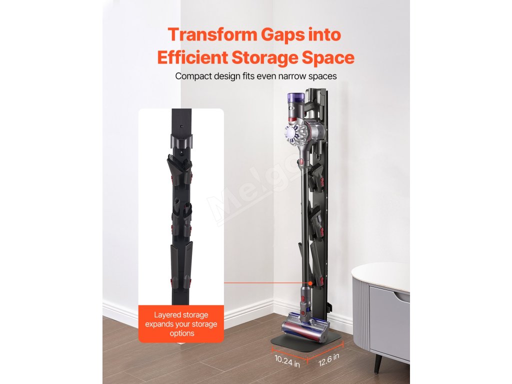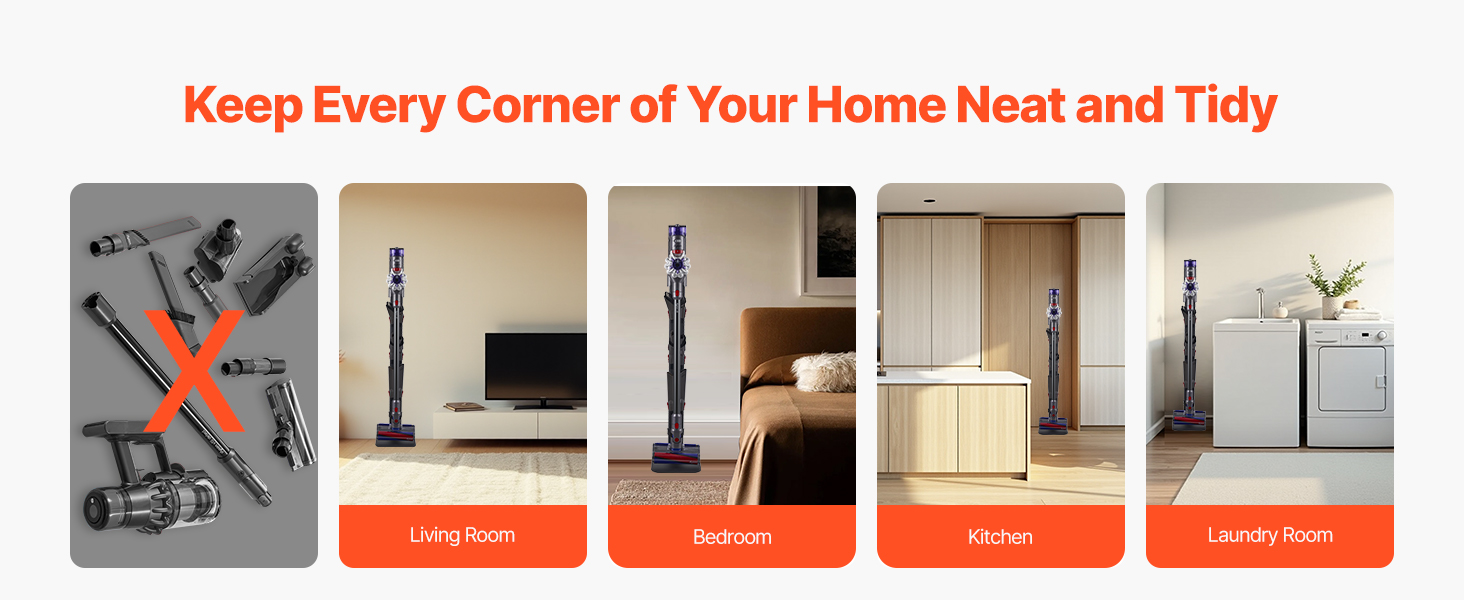 Či už v obývacej izbe, spálni, kuchyni alebo v práčovni, tento stojan pomáha usporiadať vysávač a príslušenstvo, čím uvoľňuje miesto na podlahe a udržiava vaše obytné priestory bez neporiadku pre čistý domov.