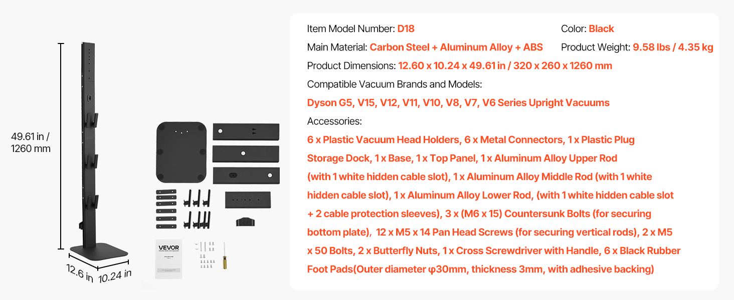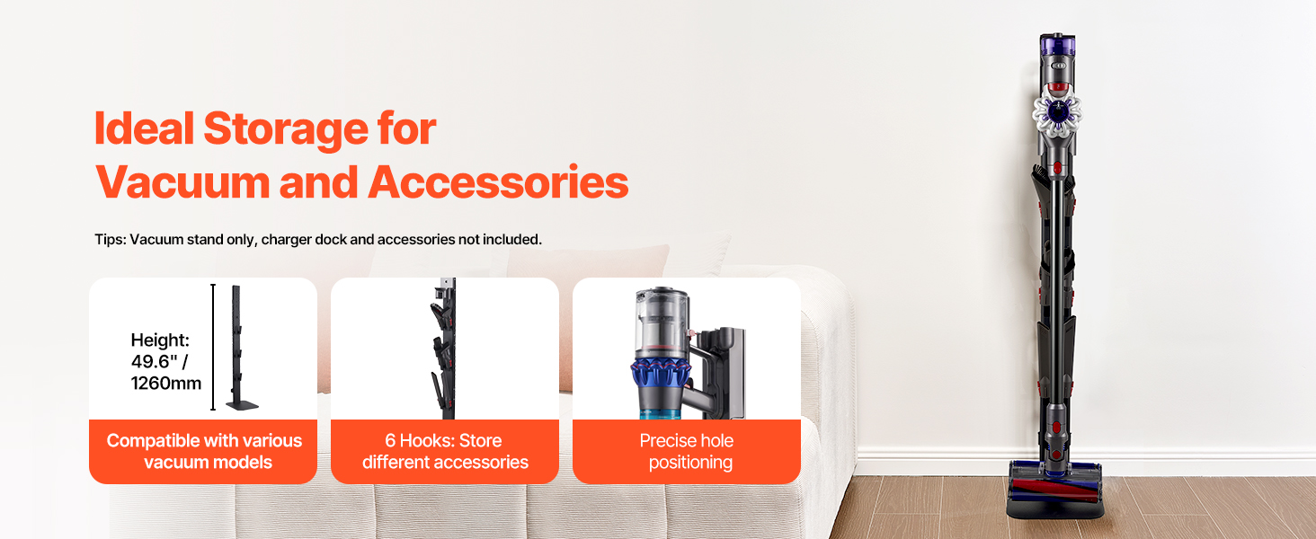 Tento stojan na vysávač poskytuje výšku 49,6 palca a 6 háčikov pre rôzne modely. Vďaka odolnej základni, rámu z uhlíkovej ocele a protišmykovým nožičkám je stabilný a kompaktný, ideálny do malých priestorov. Ľahko sa inštaluje bez vŕtania do steny a je ideálnym riešením na uskladnenie.
