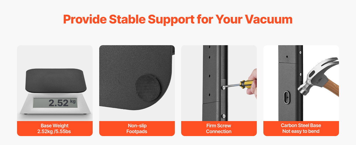 Náš stojan na vysávače má 2,52 kg (5,55 lbs) ťažkú základňu s protišmykovými nožičkami a skrutkovými spojmi, ktoré zaisťujú stabilitu. Je vyrobený z odolnej za studena valcovanej ocele SPCC, je pevný a nie je náchylný na ohýbanie ani deformáciu.