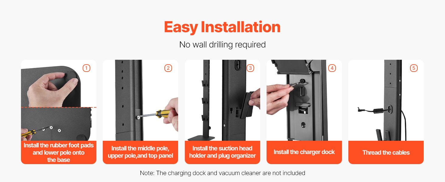 Samostatná konštrukcia stojana eliminuje potrebu montáže na stenu, čo umožňuje bezpečné uloženie vášho vysávača. Vďaka jednoduchým krokom inštalácie základne, háčikov a hornej dosky ho môžete rýchlo nastaviť bez problémov so zložitou inštaláciou.