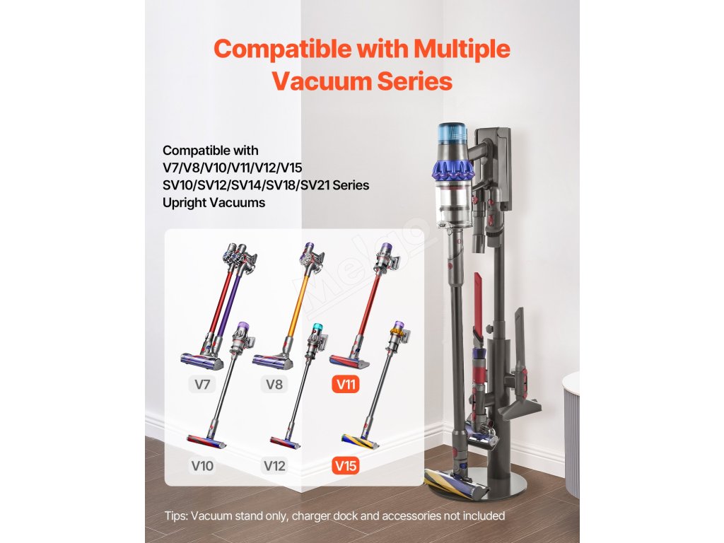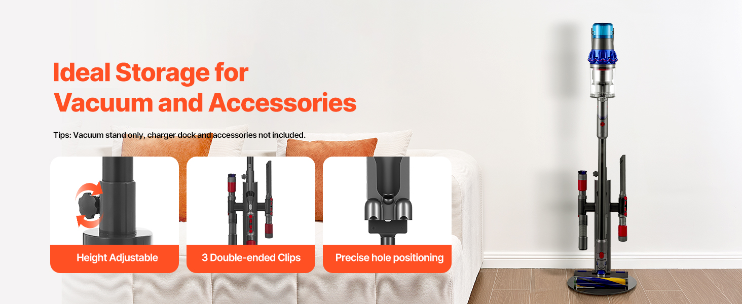 Či už v obývacej izbe, spálni, kuchyni alebo v práčovni, tento stojan pomáha usporiadať vysávač a príslušenstvo, čím uvoľňuje miesto na podlahe a udržiava vaše obytné priestory bez neporiadku pre čistý domov.
