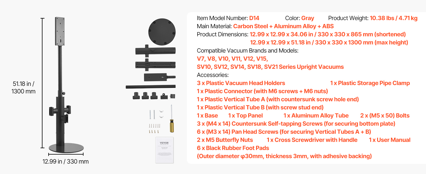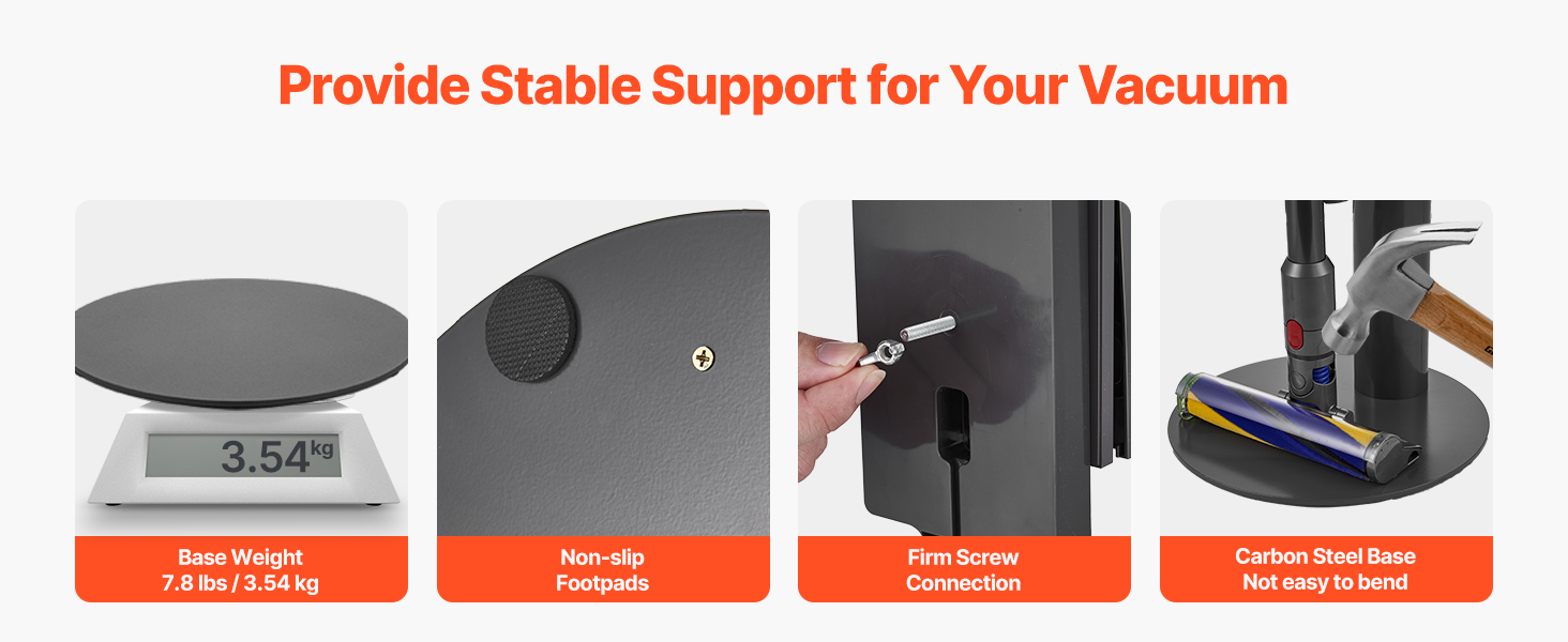 Tento stojan na vysávač je vybavený 3,54 kg (7,8 lbs) ťažkou základňou s protišmykovými nožičkami a skrutkovými spojmi, ktoré zabezpečujú stabilitu. Vysokokvalitná základňa z uhlíkovej ocele je vyrobená tak, aby dlho vydržala a bola pevná proti ohýbaniu a deformácii.