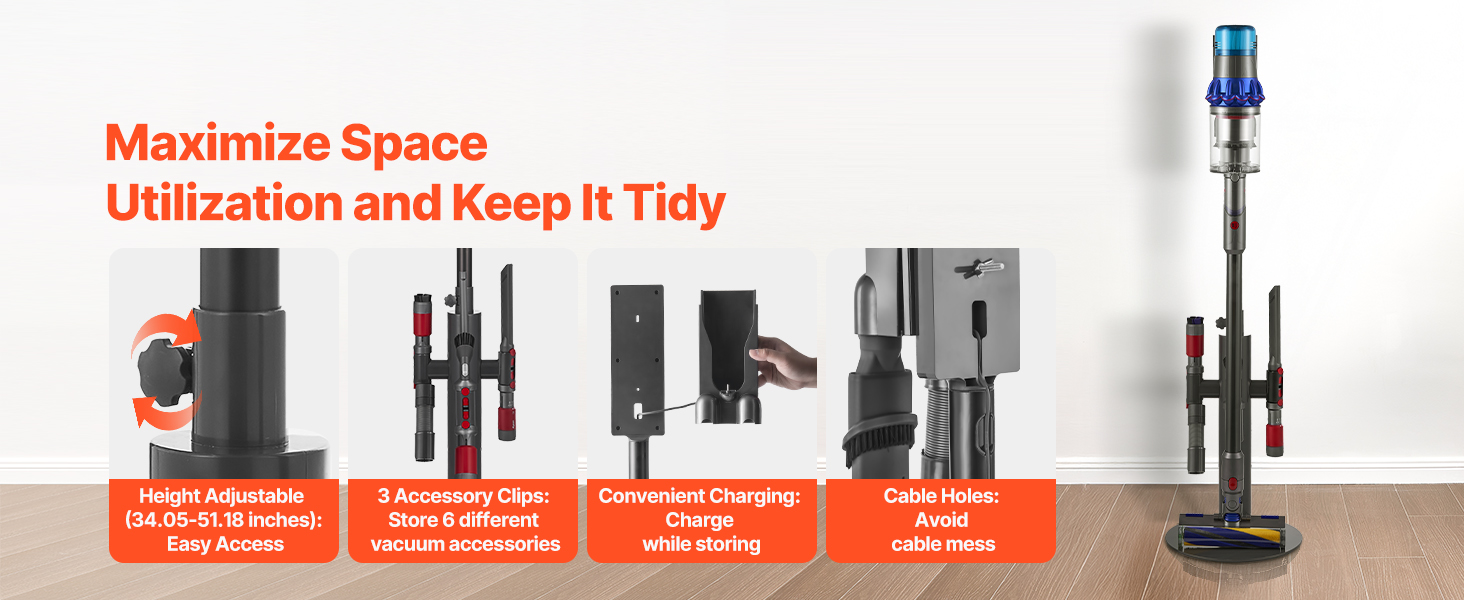Vďaka nastaviteľnému výškovému rozsahu 34,05-51,18 palca sa tento stojanový držiak vysávača hodí do rôznych priestorov pre ľahký prístup. V 3 klipoch je uložených 6 rôznych druhov príslušenstva, vďaka čomu je všetko upratané. Konštrukcia podporuje aj nabíjanie počas skladovania a otvor na kábel zabraňuje neporiadku.