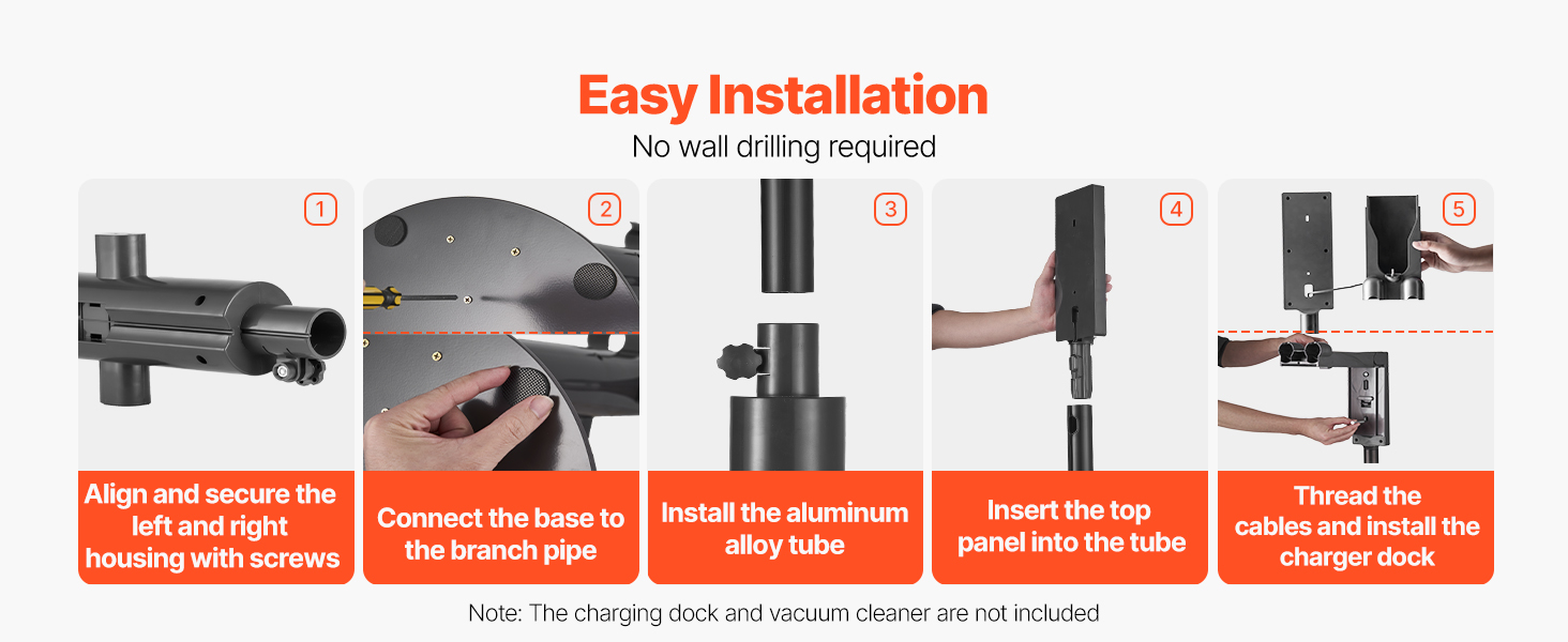 Tento stojan na vysávač je nastaviteľný, s 3 klipmi, ktoré sa hodia na viacero modelov. Odolná základňa, rám z uhlíkovej ocele a protišmykové nožičky zaisťujú stabilitu, zatiaľ čo otvor na kábel udržiava poriadok. Je kompaktný a ľahko sa inštaluje, je ideálny do malých priestorov a nevyžaduje si vŕtanie do steny.