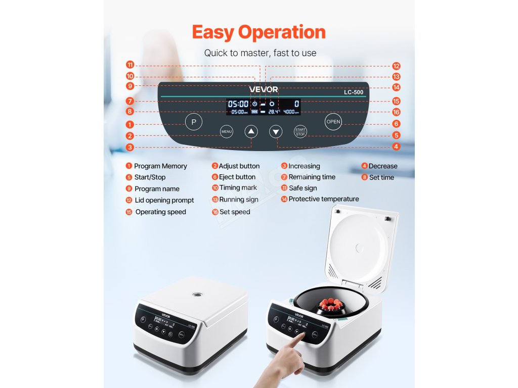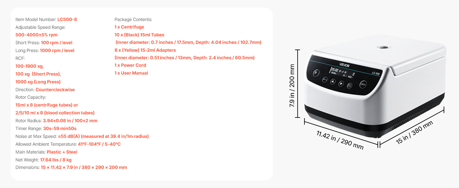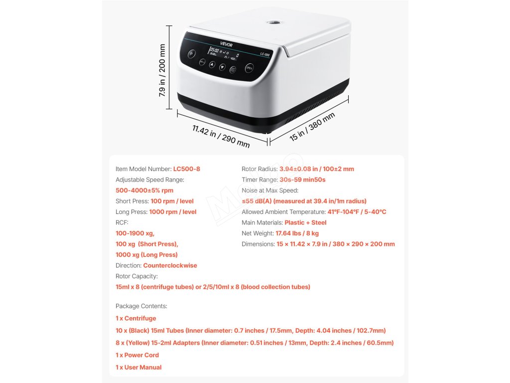 Táto nízkootáčková odstredivka poskytuje 500 - 4000 ±5 % otáčok za minútu a 100 - 1900xg RCF. Pojme 8 x 15ml odstreďovacích skúmaviek alebo 8 x 2/5/10ml skúmaviek na odber krvi a je vybavená časovačom 30s-59min50s, pamäťou programov, automatickým zastavením veka, ochranou proti prehriatiu a protišmykovými nožičkami. Ideálne pre rôzne priemyselné odvetvia.