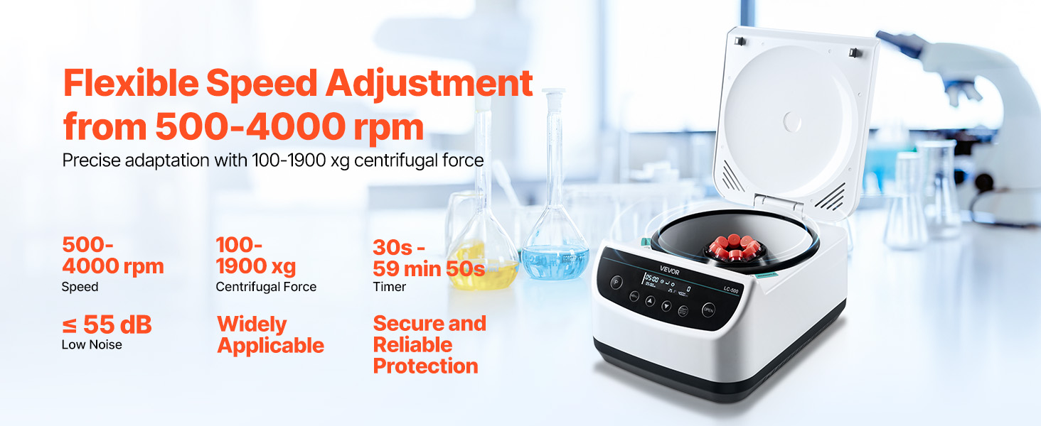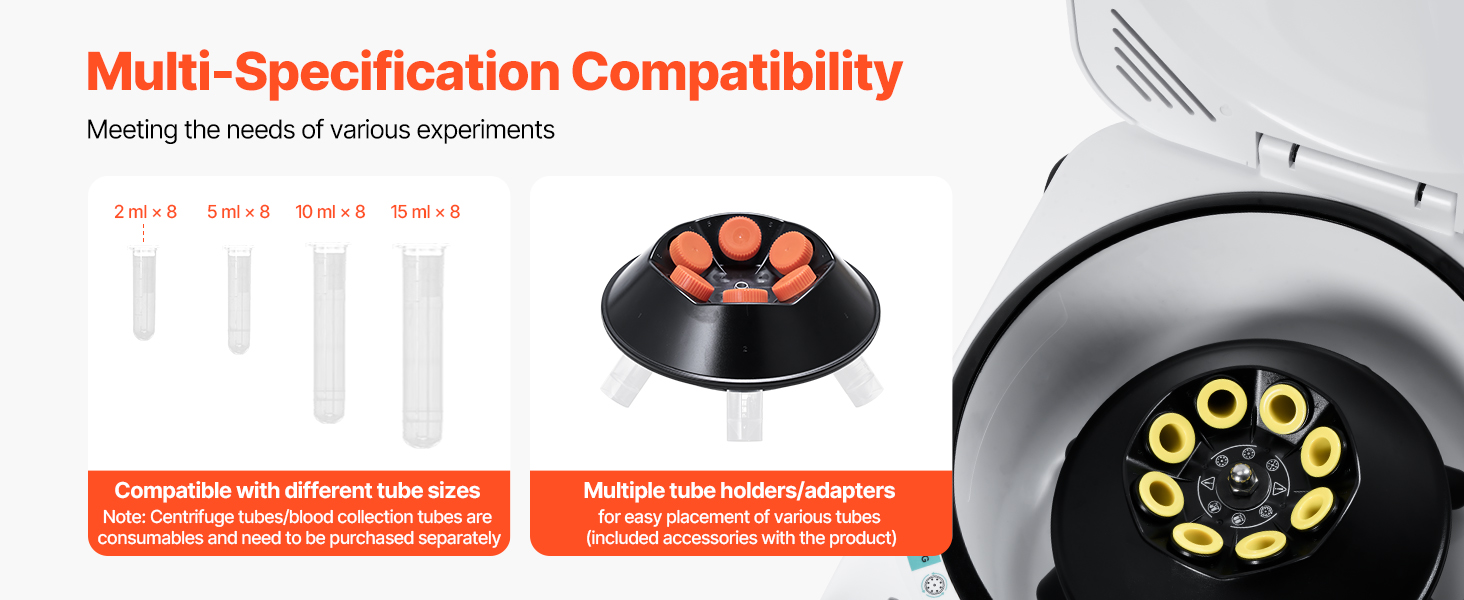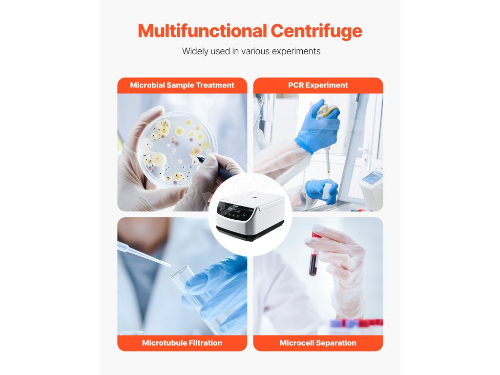 Táto odstredivka je vhodná pre širokú škálu odstrediviek, od mikrotrubičiek až po skúmavky s väčšou kapacitou, čím poskytuje efektívne riešenie pre rôzne experimentálne potreby.