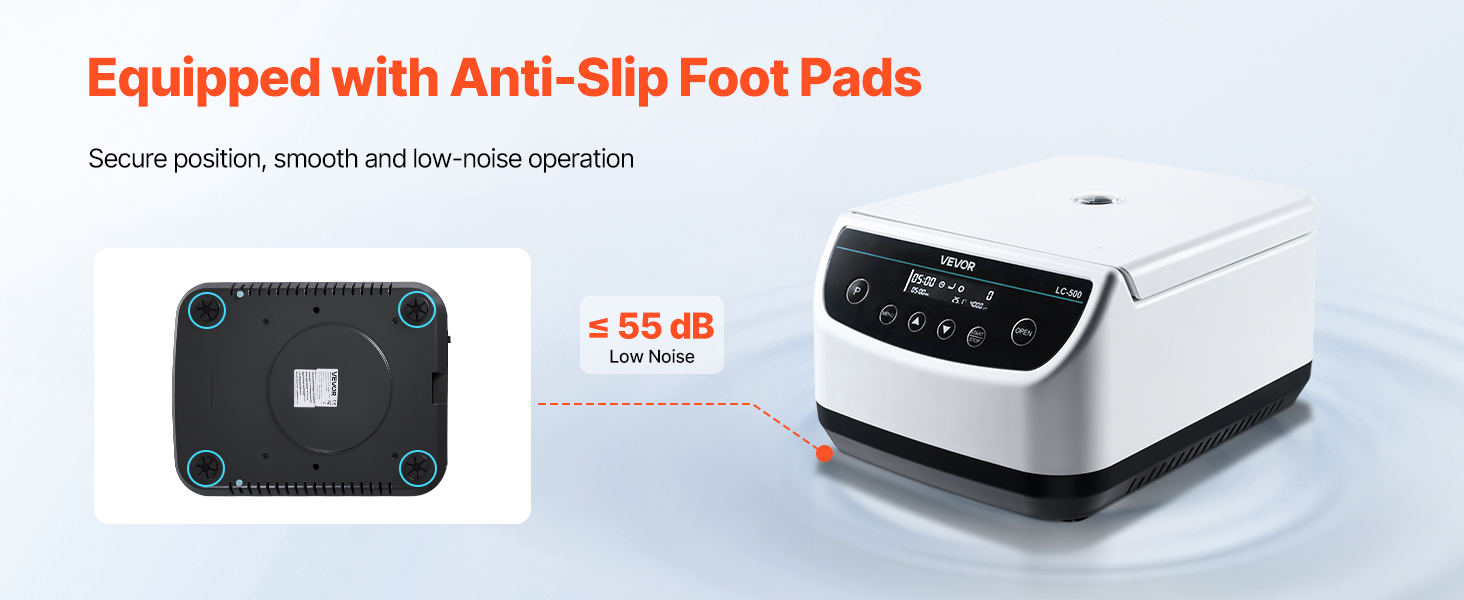 Stolová laboratórna odstredivka je vybavená protišmykovými nožičkami na základni, ktoré účinne zabezpečujú zariadenie na mieste a zabraňujú jeho pohybu počas prevádzky. Zabezpečuje plynulý výkon aj pri vysokých rýchlostiach, pričom hladina hluku sa udržiava na úrovni ≤ 55 dB, čo zaručuje tichú prevádzku.