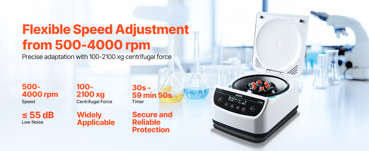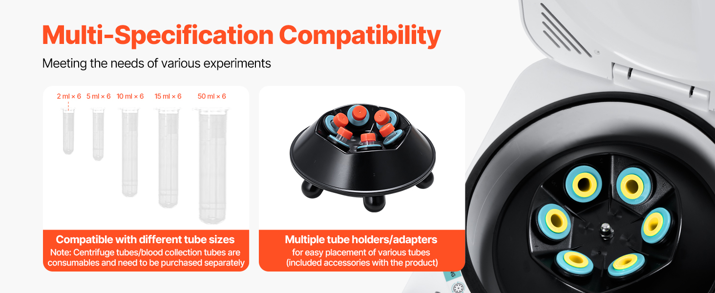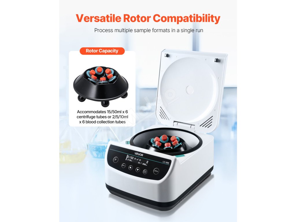 Táto odstredivka je vhodná pre širokú škálu odstrediviek, od mikrotrubičiek až po skúmavky s väčšou kapacitou, čím poskytuje efektívne riešenie pre rôzne experimentálne potreby.