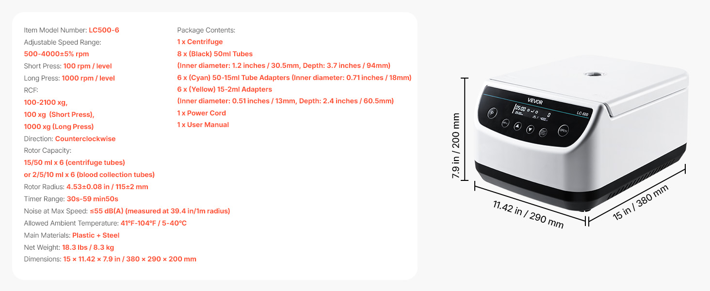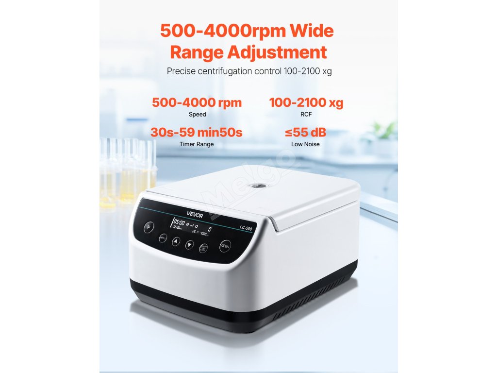 Táto nízkootáčková odstredivka poskytuje 500 - 4000 ±5 % otáčok za minútu a 100 - 2100xg RCF. Pojme 6 x 15/50ml odstreďovacích skúmaviek alebo 6 x 2/5/10ml skúmaviek na odber krvi a je vybavená časovačom 30s-59min50s, pamäťou programov, automatickým zastavením veka, ochranou proti prehriatiu a protišmykovými nožičkami. Ideálne pre rôzne priemyselné odvetvia.