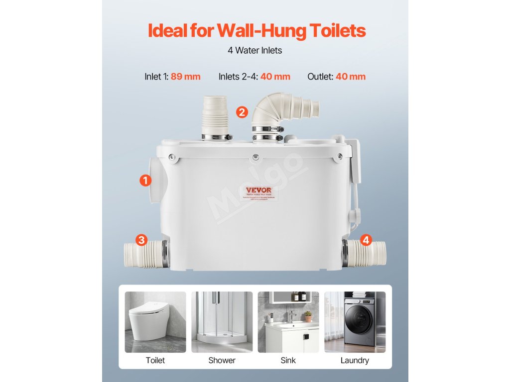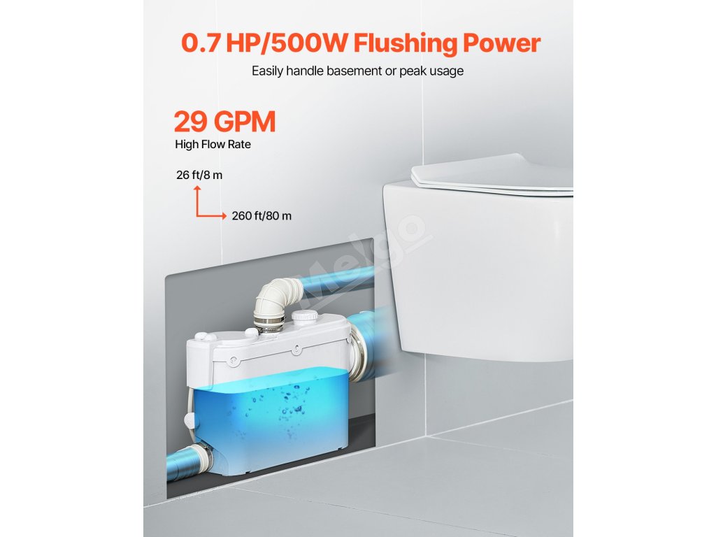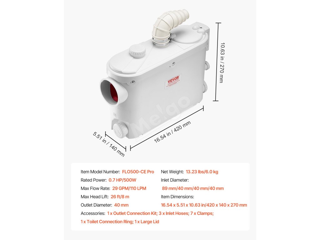 Hľadáte spôsob, ako jednoducho a rýchlo zlikvidovať odpadovú vodu? Toto macerátorové čerpadlo VEVOR poskytuje vysoký výtlak 8 m a veľký prietok 6600 l/h s výkonným 500W medeným motorom. Či už ho pridávate do toalety, vane, sprchy, práčovne alebo kuchyne, tomuto kanalizačnému čerpadlu môžete dôverovať.
