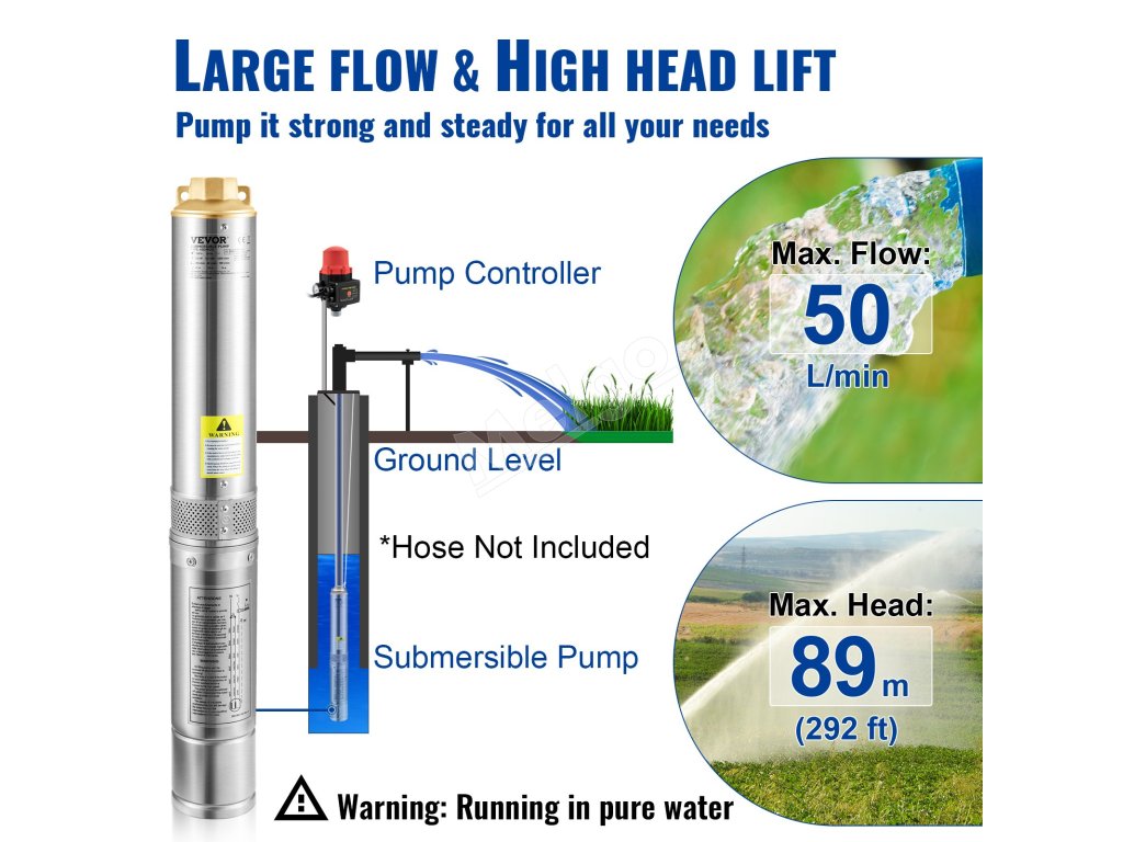 Máte obavy o zásobovanie vašej rodiny alebo poľnohospodárskej pôdy vodou? Tak sa pripravte na to, že vaša studňa bude v okamihu opäť funkčná! Naše ponorné čerpadlo do hlbokých studní poskytuje veľký prietok a vysoký výtlak, čím uspokojí všetky vaše potreby vody. Čerpajte ešte dnes s naším ponorným čerpadlom do studne!