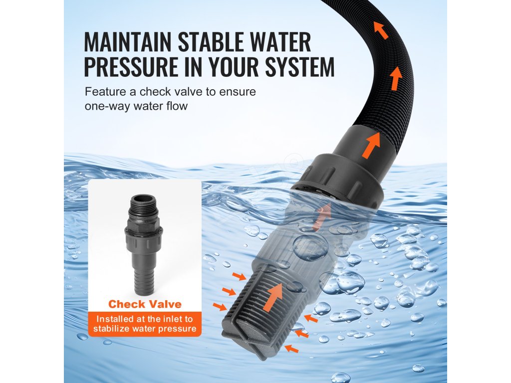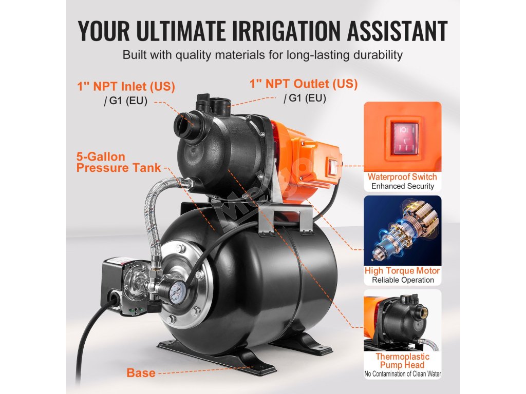 Toto čerpadlo do plytkých studní s tlakovou nádržou, ktoré sa môže pochváliť maximálnym výkonom 164 stôp (50 m) a prietokom 1000 GPH (3700 l/H), účinne zvláda prepravu vody na veľké vzdialenosti. Jeho pôsobivá schopnosť sacieho zdvihu 26,3 ft (8 m) umožňuje čerpanie vody z hlbších studní alebo zdrojov.