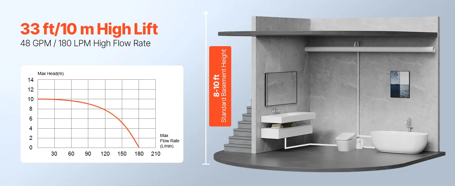 Toto čerpadlo na odvádzanie odpadových vôd s prietokom 48 GPM/180 l/min a zdvihom 33 ft/10 m spoľahlivo spracuje odpadovú vodu zo suterénov alebo vyšších poschodí.