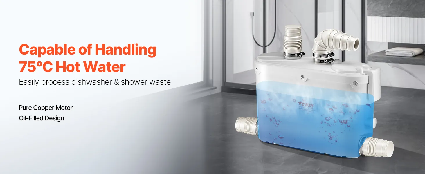 Vybavené medeným motorom a olejovou náplňou, toto maketové kanalizačné čerpadlo si ľahko poradí s odpadovou vodou až do 75 ℃/167℉ z umývačiek riadu a práčok.