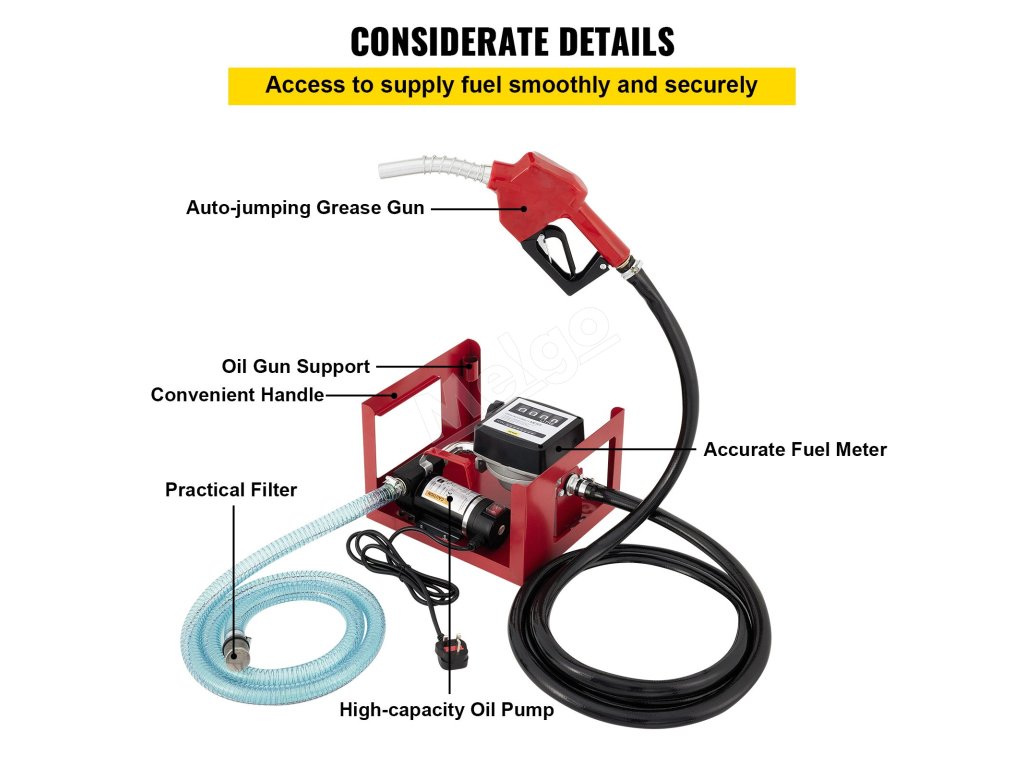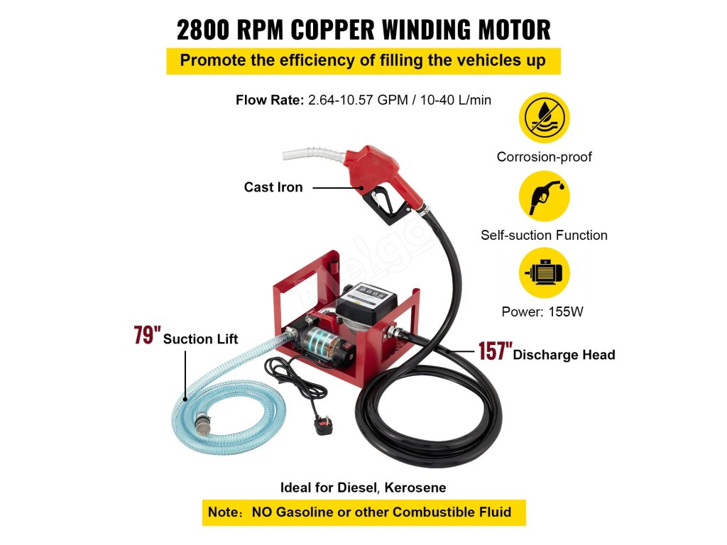 Naftové čerpadlo dokáže prečerpávať až 2,64-10,57 GPM s týmto 155W 220V medeným motorom. 2800 otáčok za minútu dokáže zabezpečiť, že toto čerpadlo bude efektívne prečerpávať palivo kamkoľvek budete chcieť.