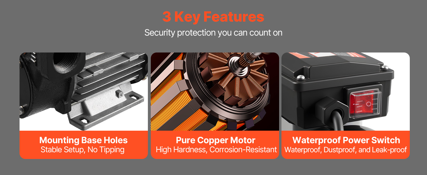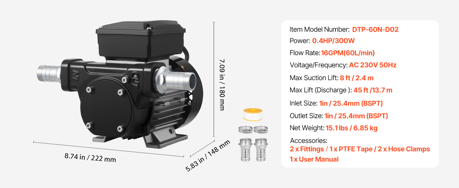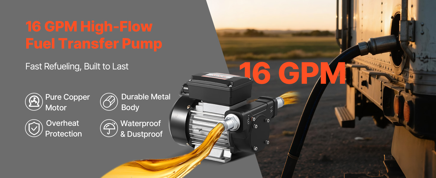 Rýchle prečerpávanie paliva s maximálnym prietokom 16 GPM (60 l/min), maximálnym nasávaním 8 stôp (2,4 m) a maximálnym zdvihom 45 stôp (13,7 m). Vďaka motoru z čistej medi, liatinovej hlave čerpadla a zabudovanej ochrane proti prehriatiu poskytuje toto čerpadlo spoľahlivý výkon a bezpečnú prevádzku pre naftu, petrolej a bionaftu.