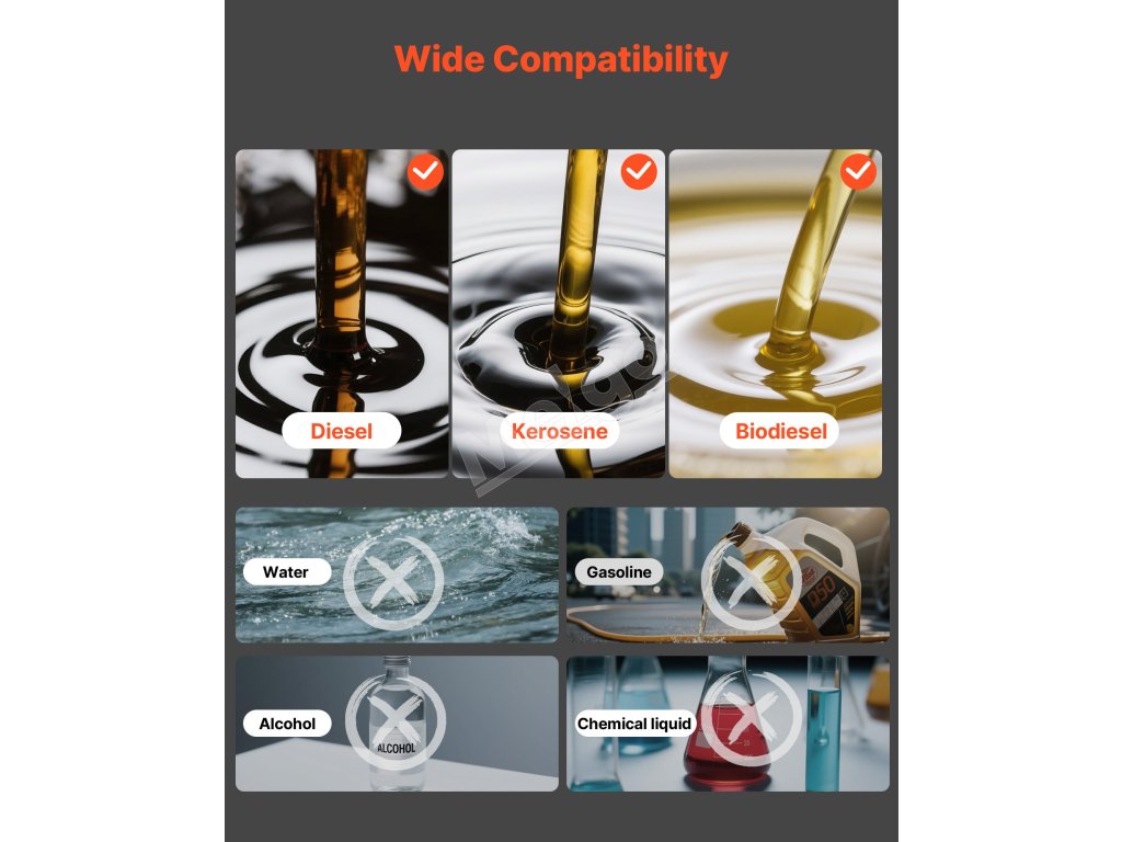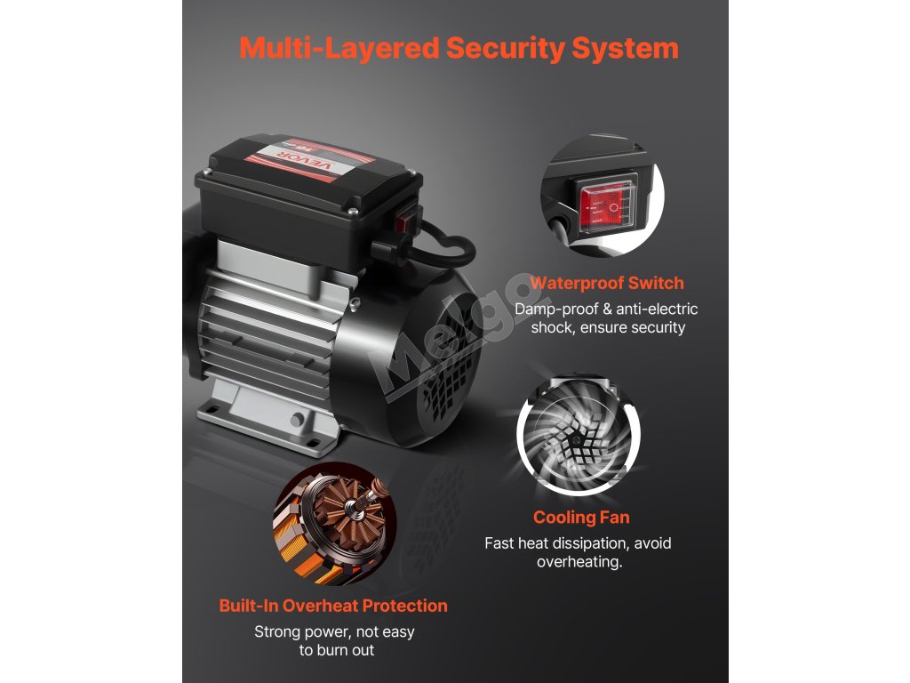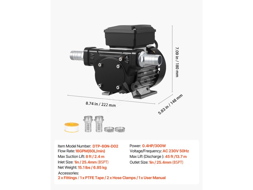 Rýchle prečerpávanie paliva s maximálnym prietokom 16 GPM (60 l/min), maximálnym nasávaním 8 stôp (2,4 m) a maximálnym zdvihom 45 stôp (13,7 m). Vďaka motoru z čistej medi, liatinovej hlave čerpadla a zabudovanej ochrane proti prehriatiu poskytuje toto čerpadlo spoľahlivý výkon a bezpečnú prevádzku pre naftu, petrolej a bionaftu.