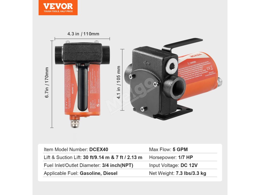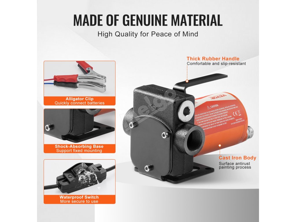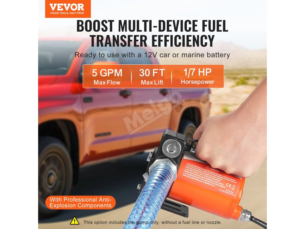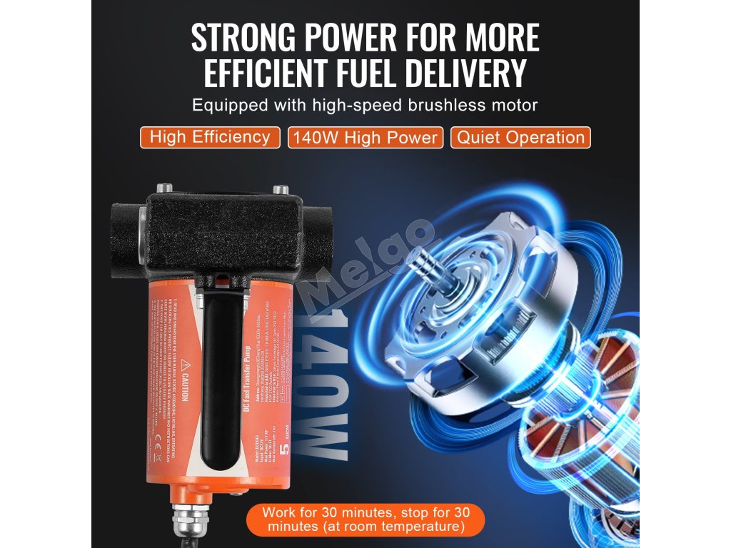 Toto čerpadlo na prečerpávanie paliva je napájané z 12 V zdroja jednosmerného prúdu a je kompatibilné s rôznymi systémami napájania, motocyklami, osobnými a nákladnými vozidlami a inými strojmi. Široko sa používa na dodávku paliva alebo vyprázdňovanie vozidiel, obytných vozidiel, lodí, poľnohospodárskych zariadení, strojov a nádrží na naftu.